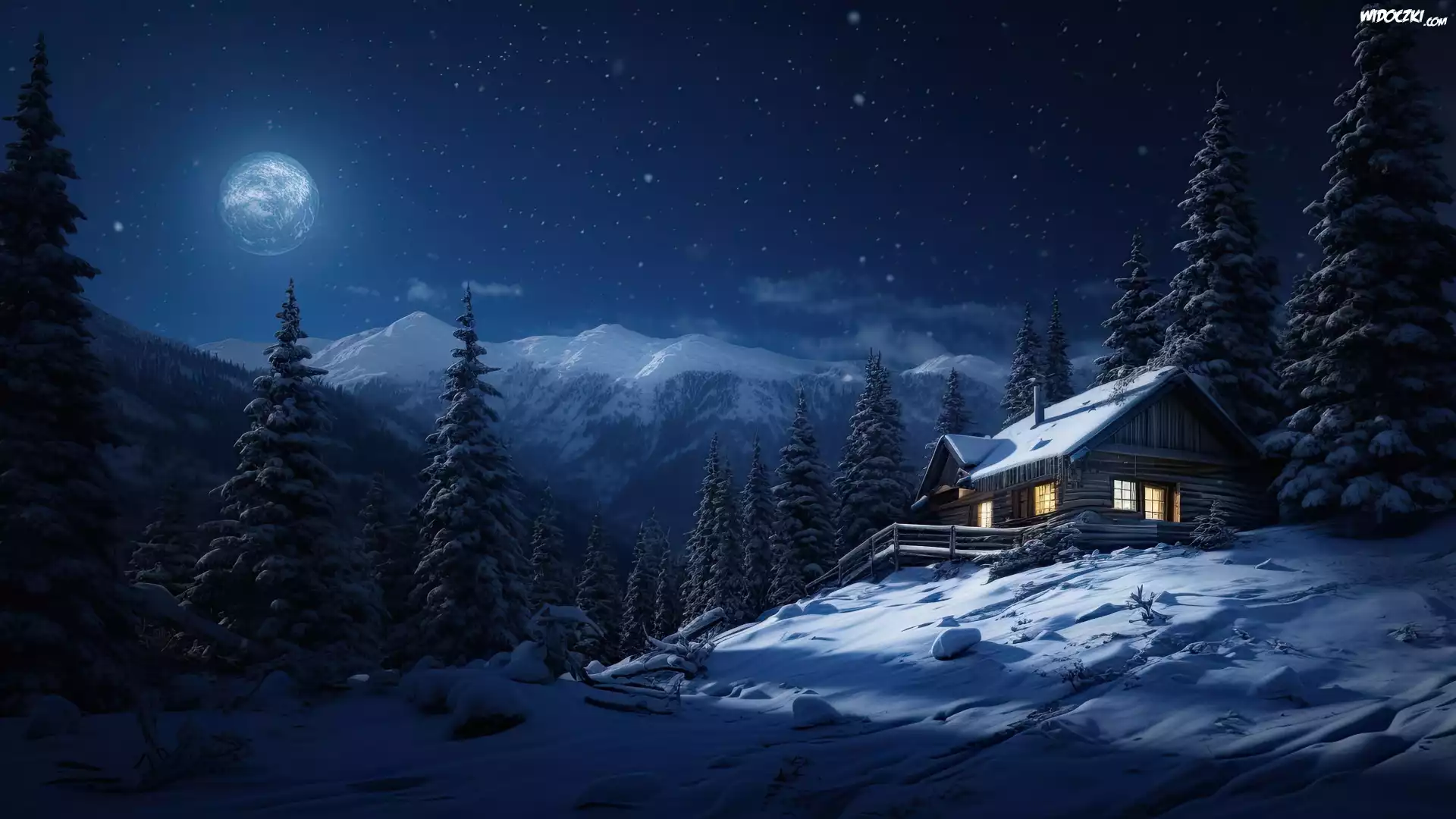Zima, Dom, Góry, Księżyc, Drzewa