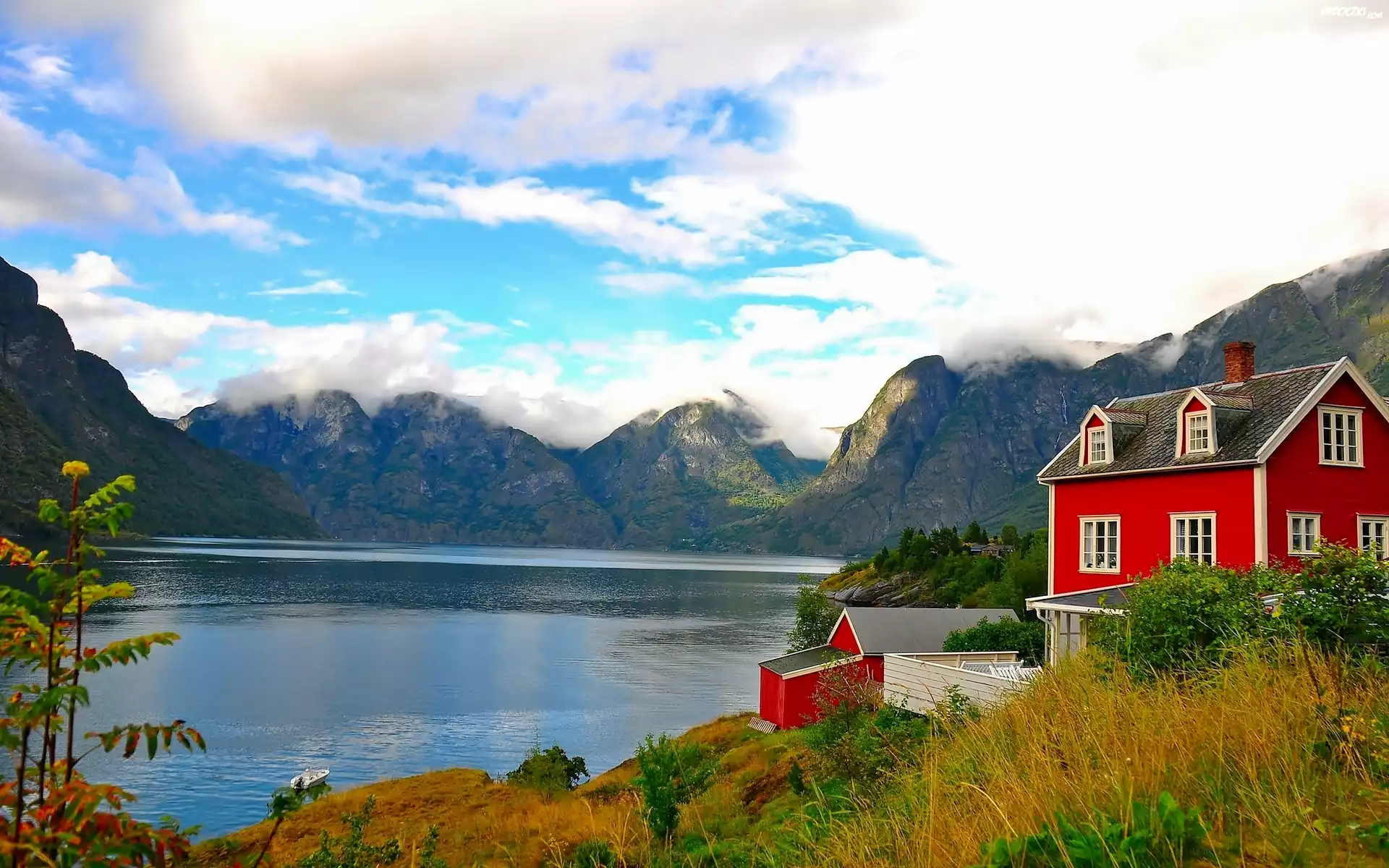 Zdjęcia, Dom, Jezioro, Góry, Obłoki