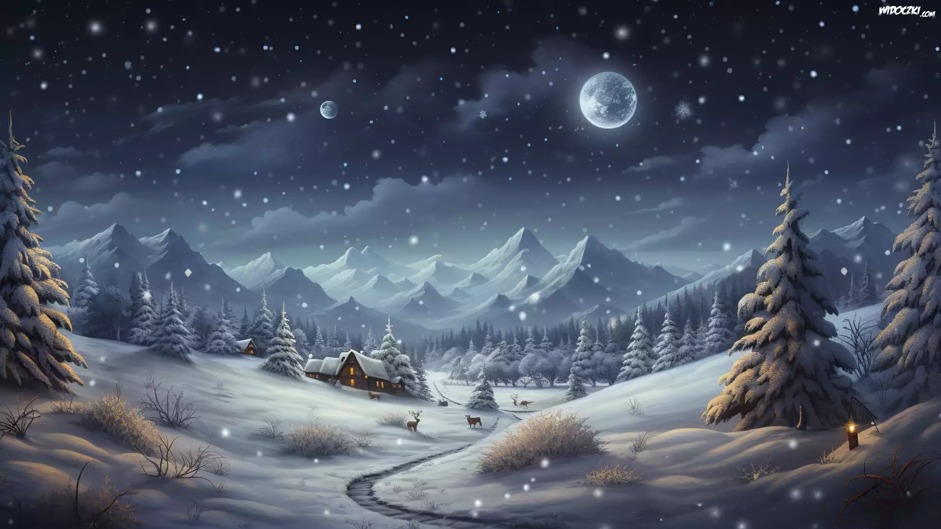 Zima, Noc, Księżyc, Dom, Góry, Grafika