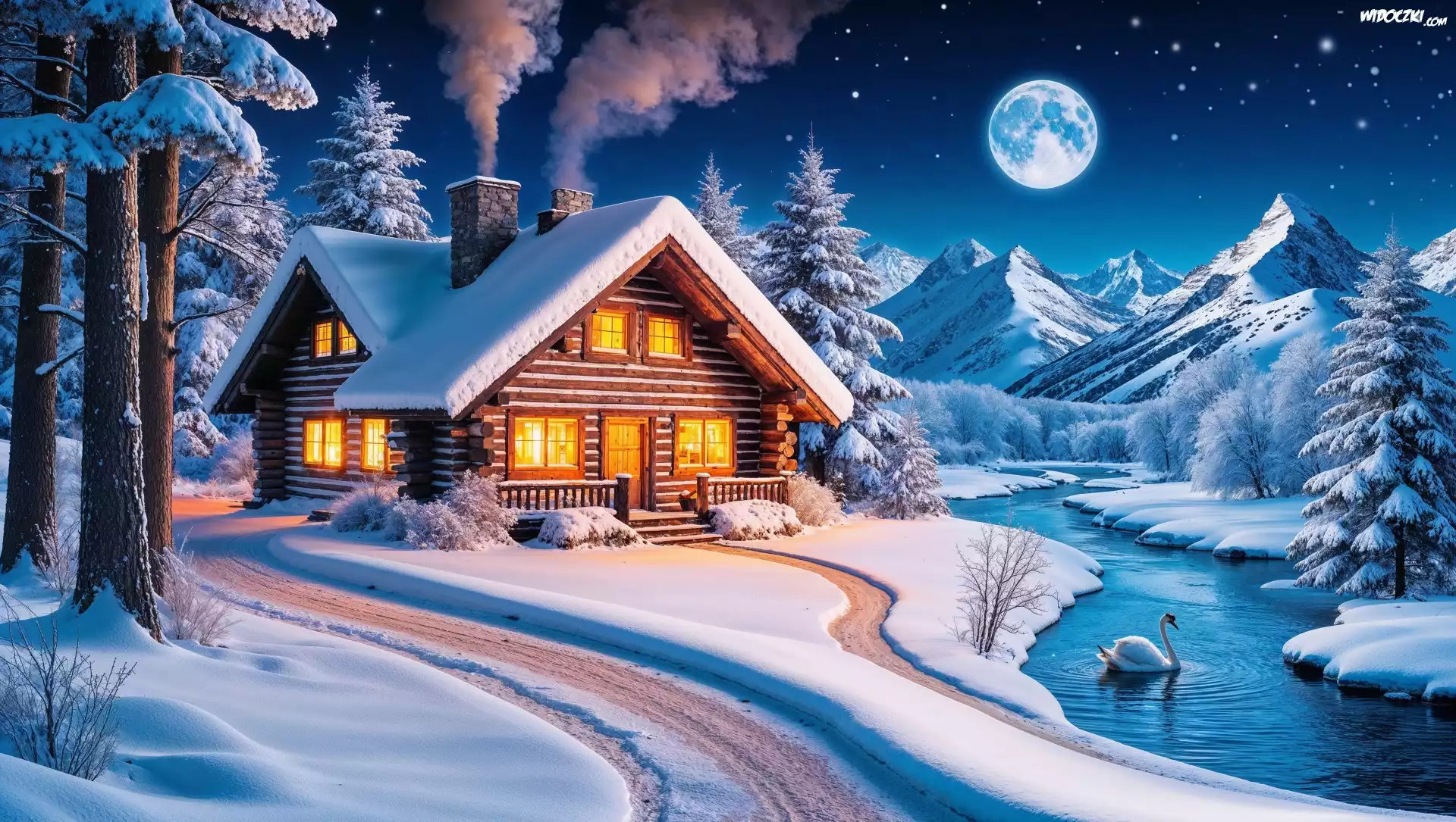 Zdjęcia, Zima, Rzeka, Łabędź, Dom, Góry, Grafika