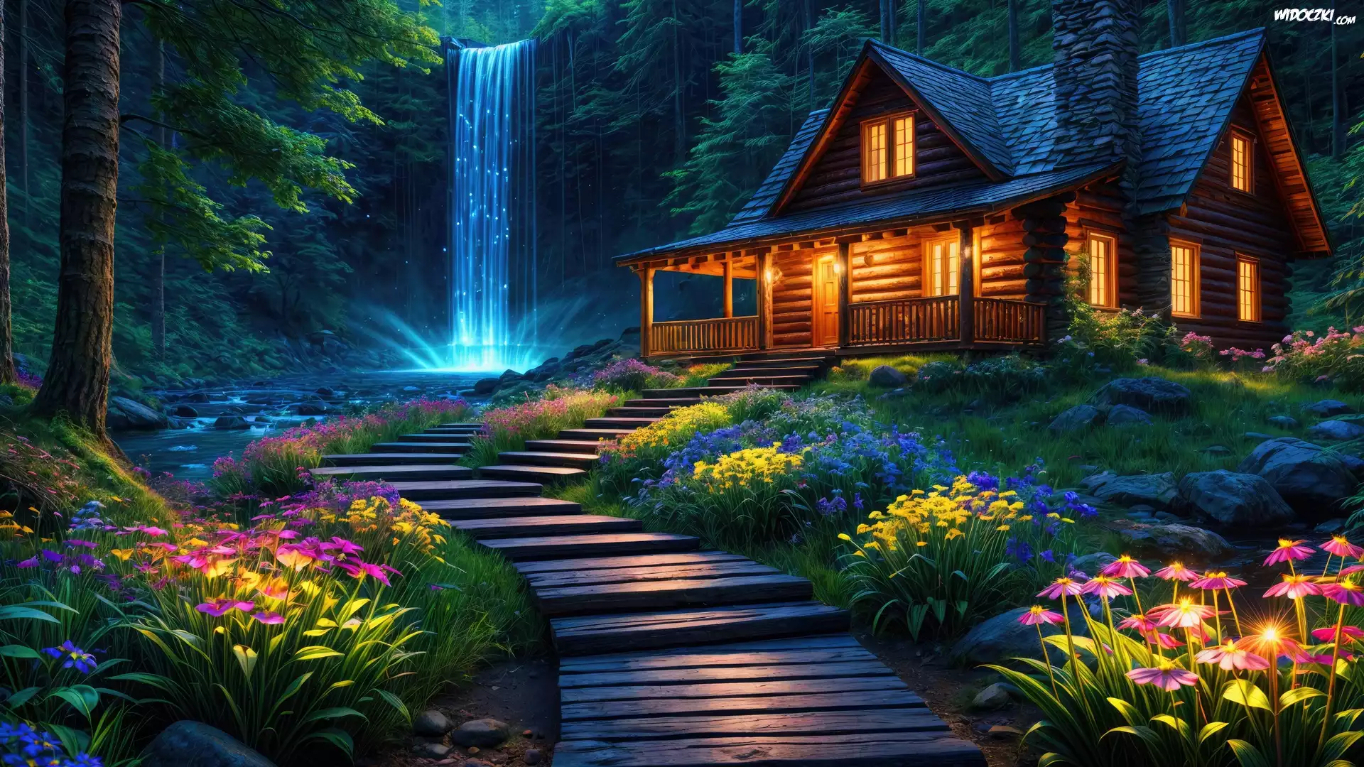Zdj臋cia, Las, Drzewa, Wodospad, Dom, Kwiaty, Grafika
