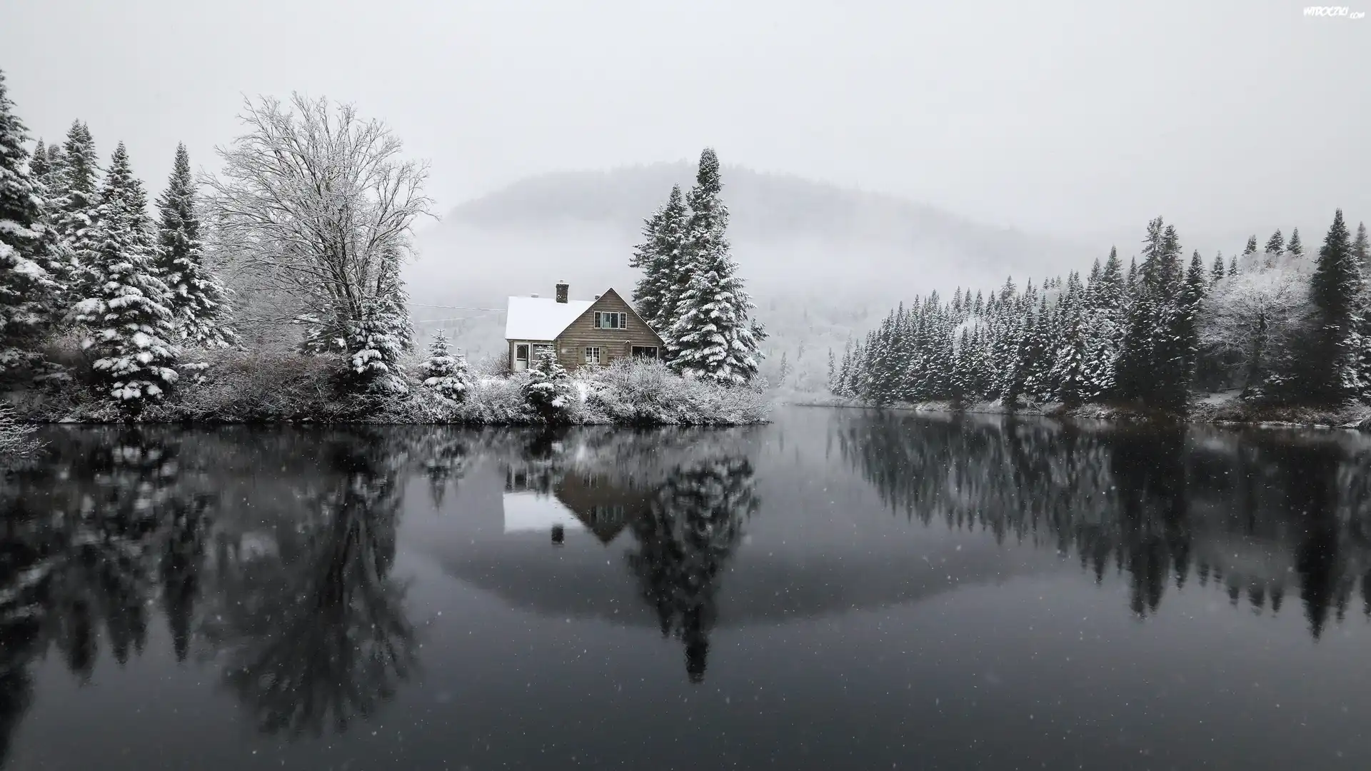 Zdjęcia, Jezioro, Dom, Zima, Śnieg, Drzewa, Świerki, Odbicie