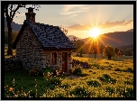 Dom, Zachód słońca, Góry, Drzewa, Trawa, Kwiaty, Promienie słońca