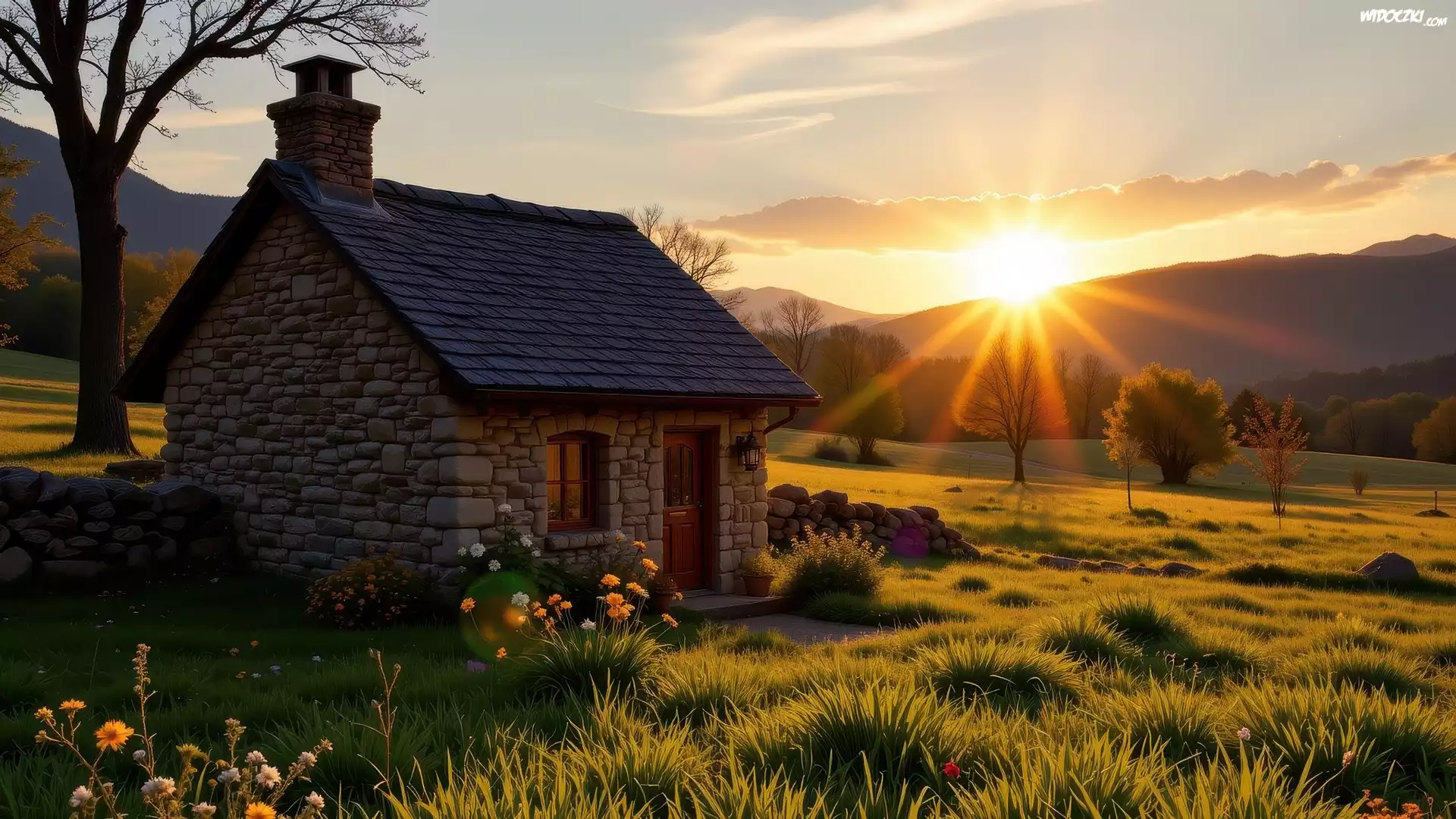 Zdjęcia, Dom, Zachód słońca, Góry, Drzewa, Trawa, Kwiaty, Promienie słońca