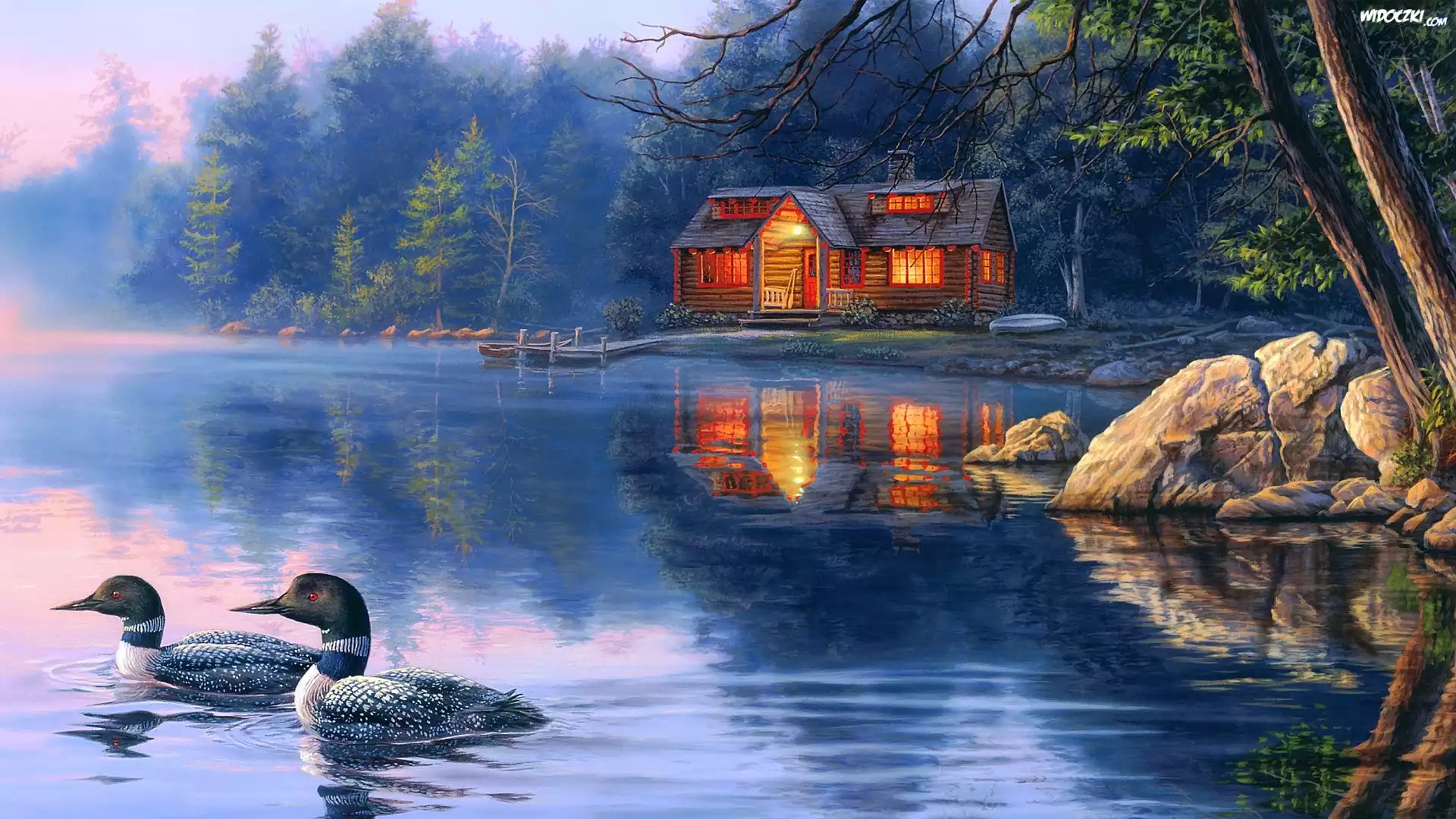 Zdjęcia, Oświetlony, Drewniany, Dom, Pomost, Las, Jezioro, Kaczki, Mgła, Malarstwo, Darrell Bush