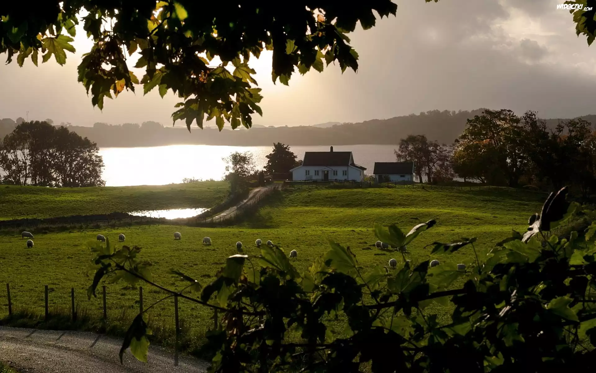 Dom, Jezioro, Łąka, Mgła, Poranek