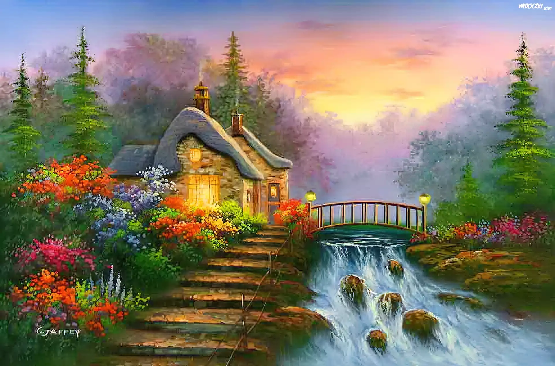 Zdj臋cia, Dom, Schody, Rzeka, Most, Kwiaty