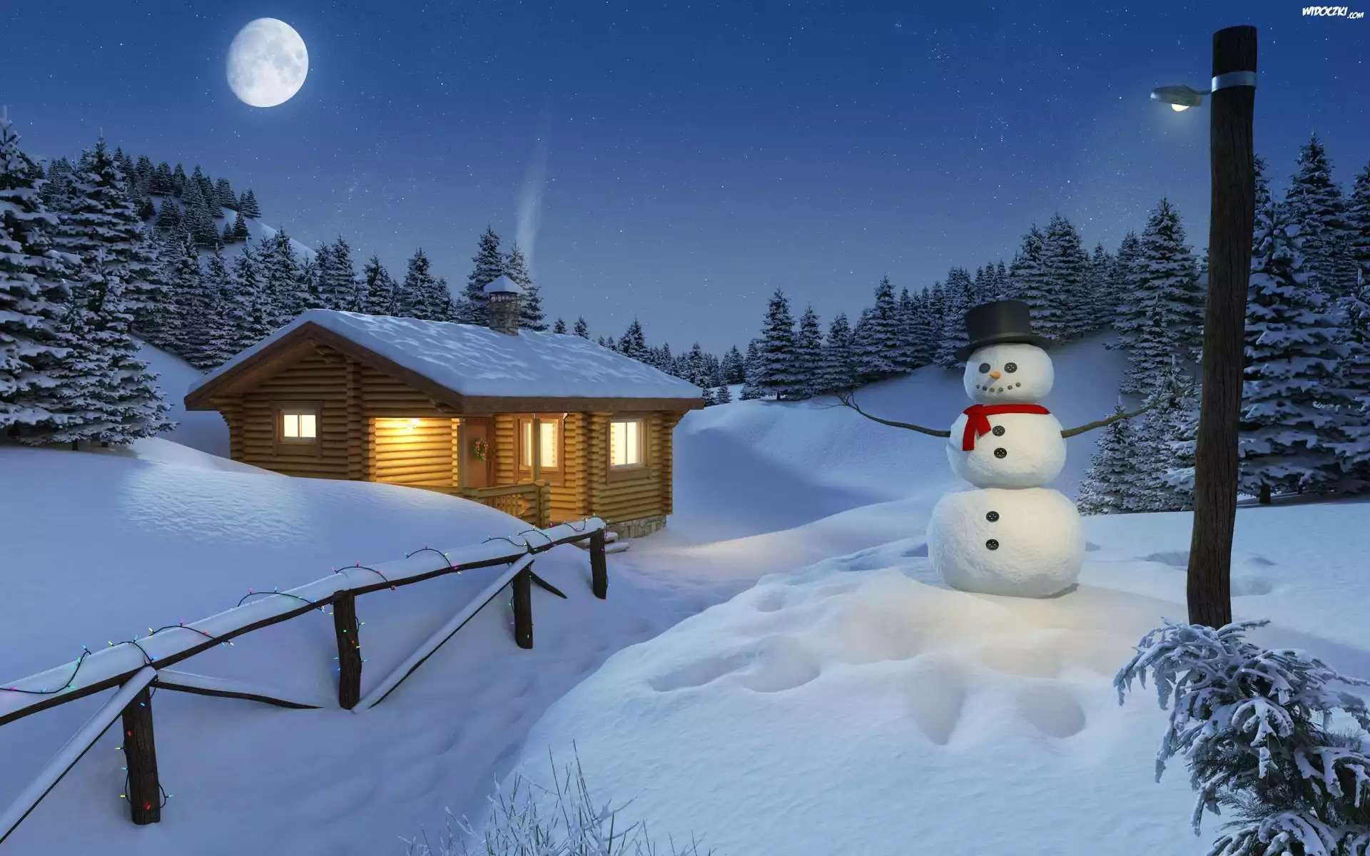 Dom, Góry, Lasy, Bałwanek, Noc, Zima