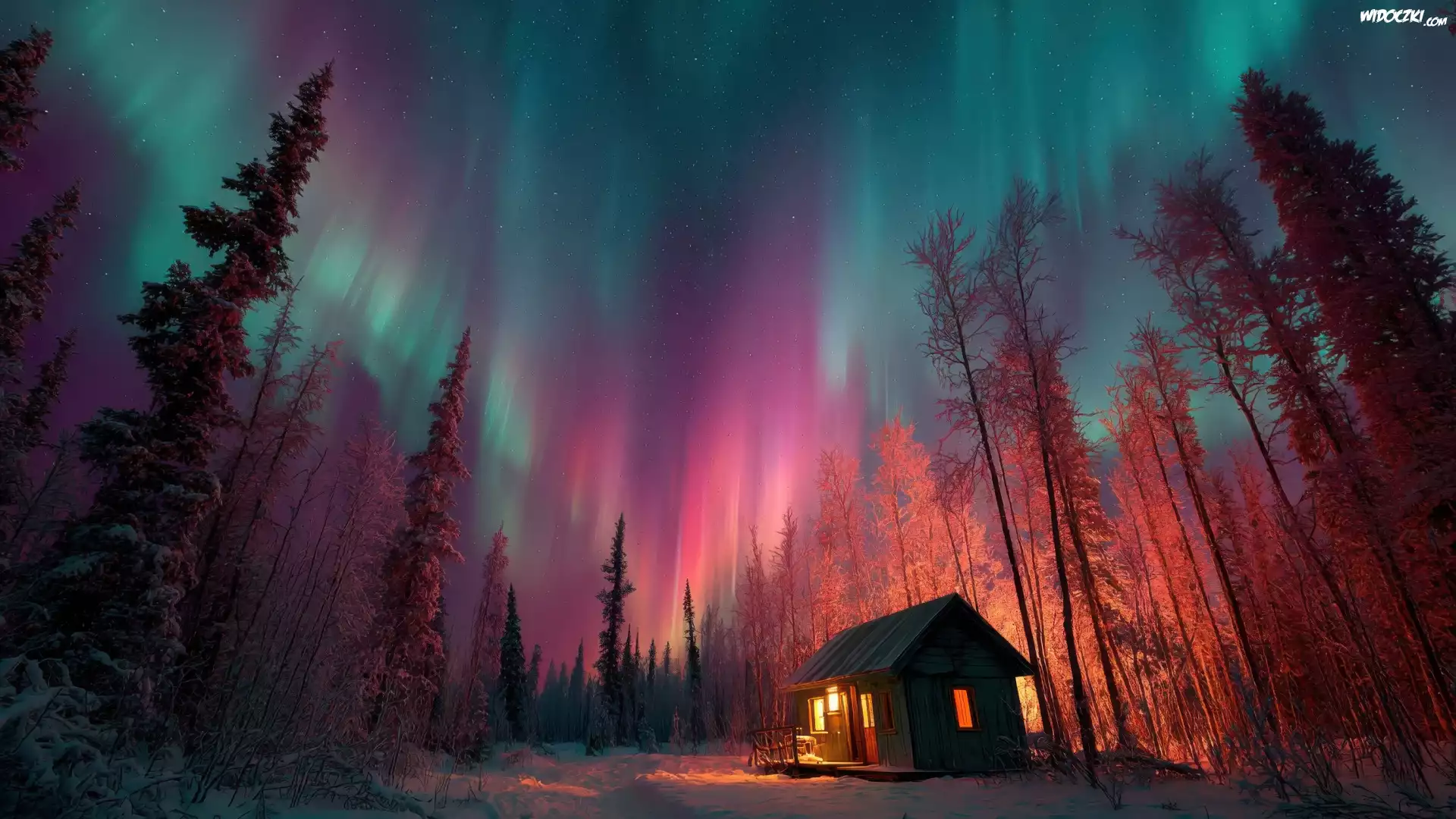 Zorza polarna, Noc, Zima, Ośnieżone, Drzewa, Oświetlony, Dom