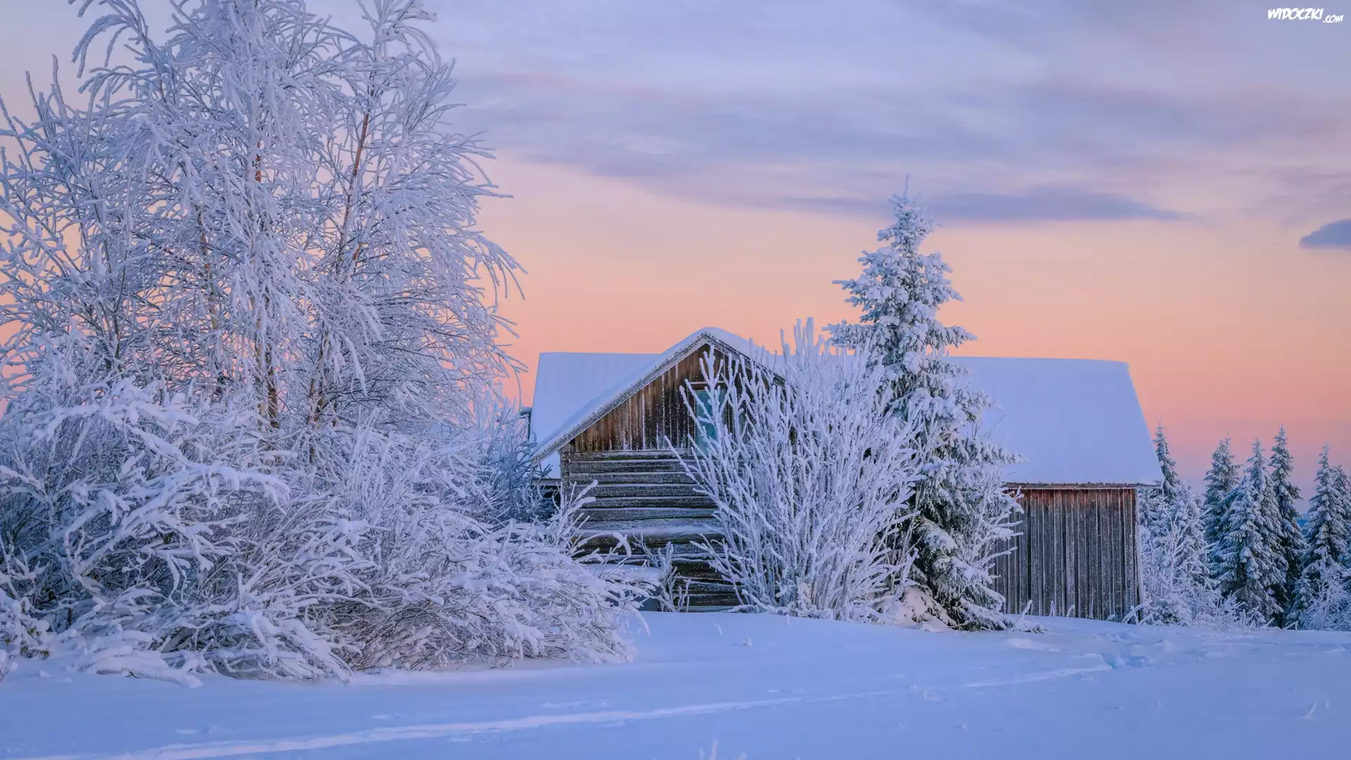 Zima, Drzewa, Ośnieżone, Dom, Drewniany, Krzewy, Śnieg