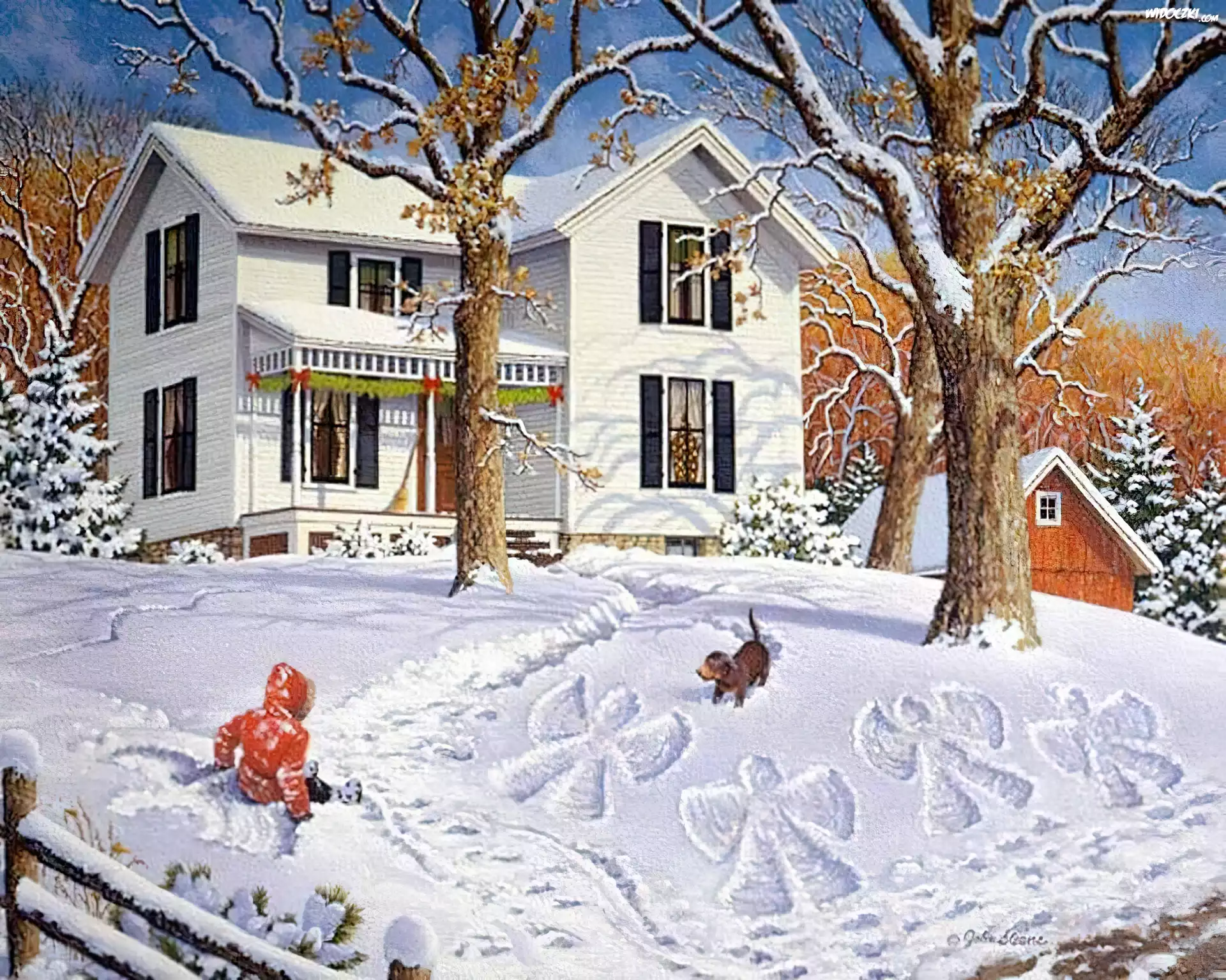 Zdjęcia, Dom, Dziecko, Pies, Zima