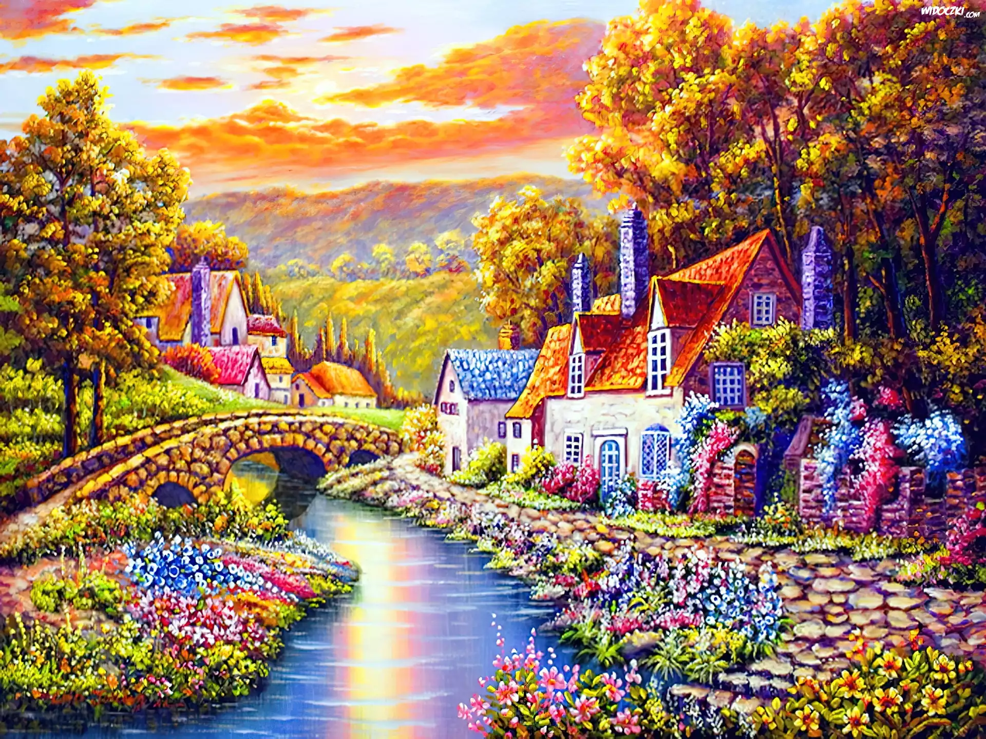 Dom, Rzeka, Most, Niebo, Reprodukcje Obrazów