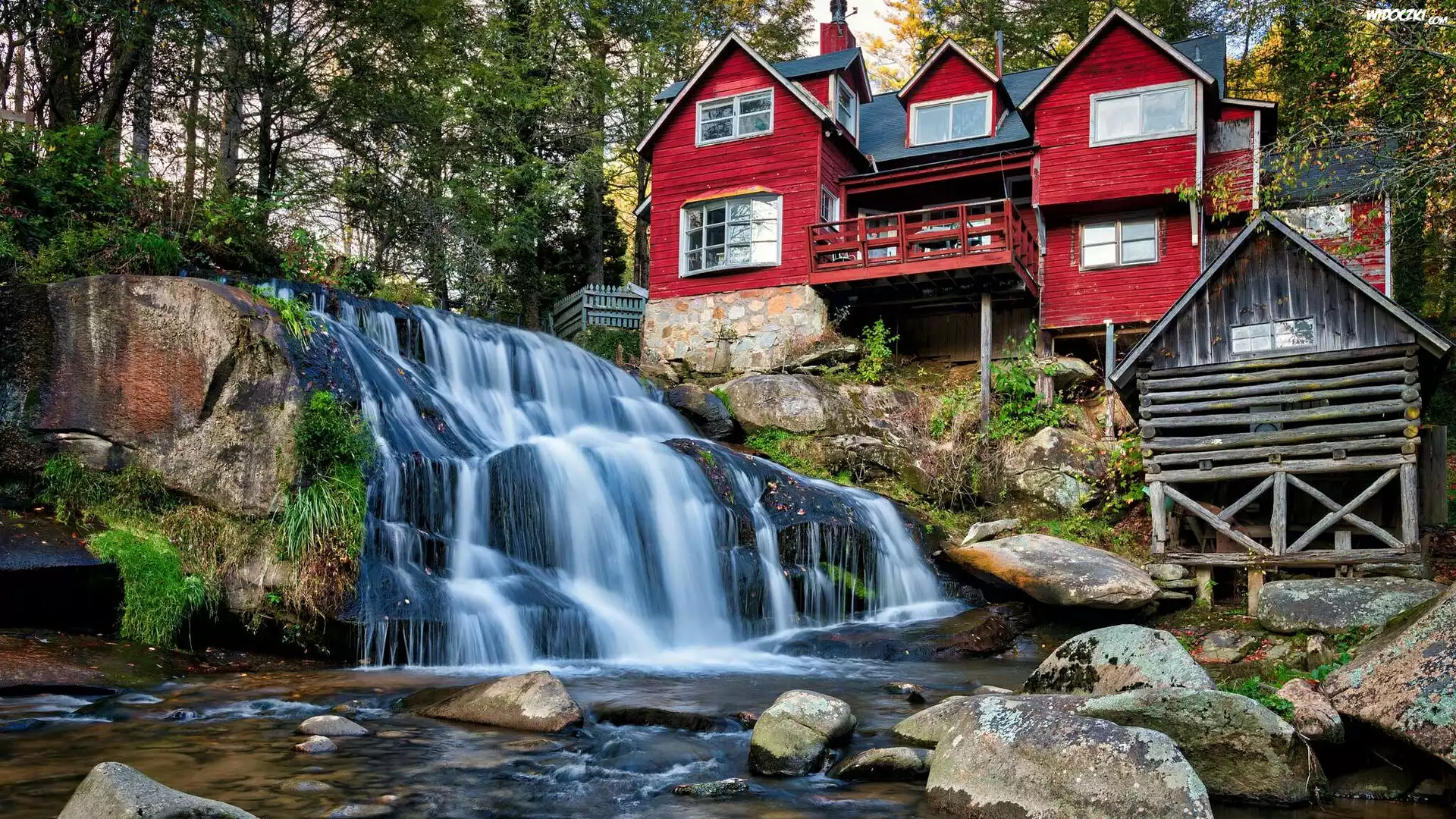 Zdjęcia, Dom, Skała, Drzewa, Wodospad, Rzeka, Kamienie