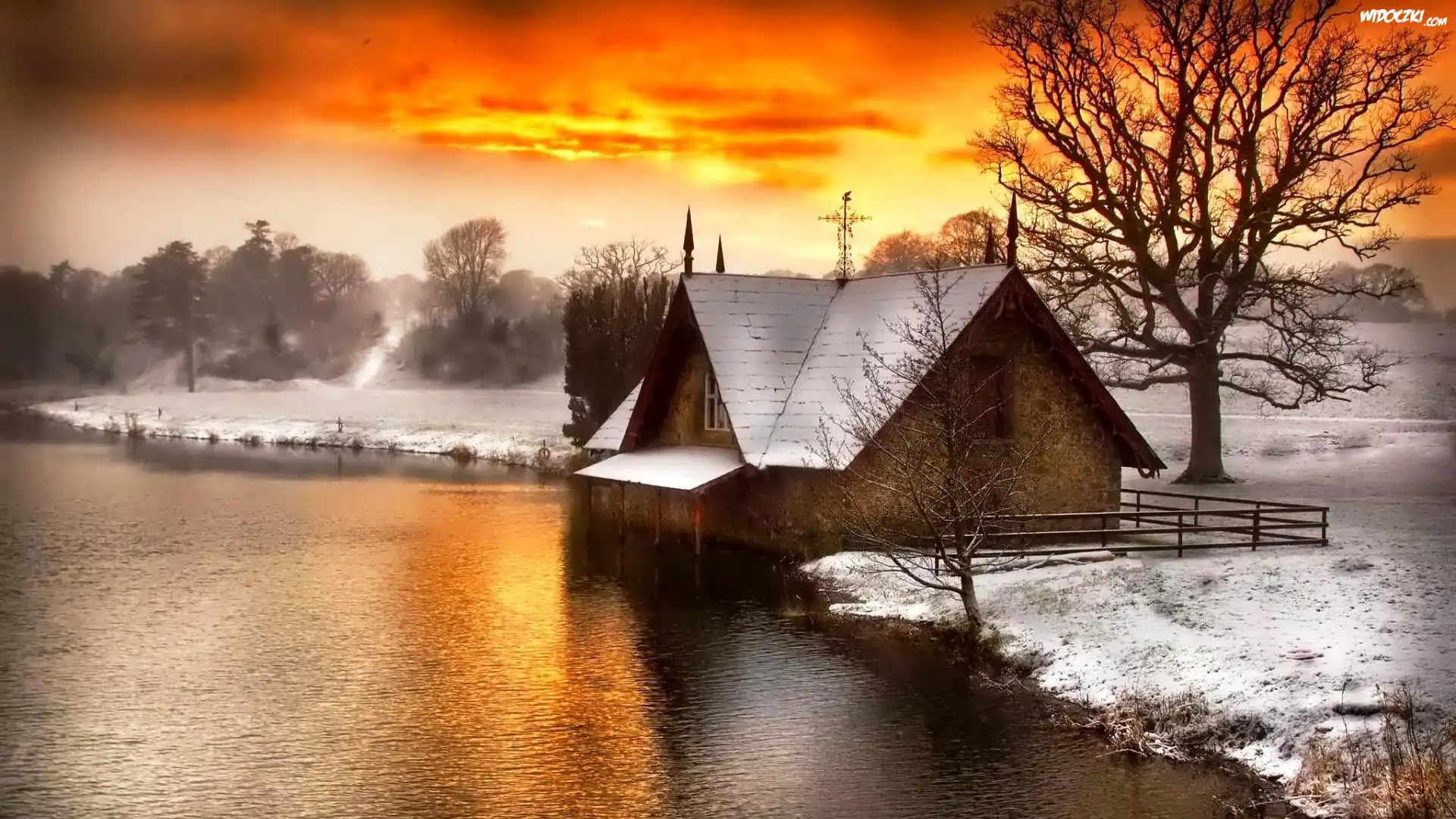 Dom, Rzeka, Drzewa, Zachód Słońca, Zima