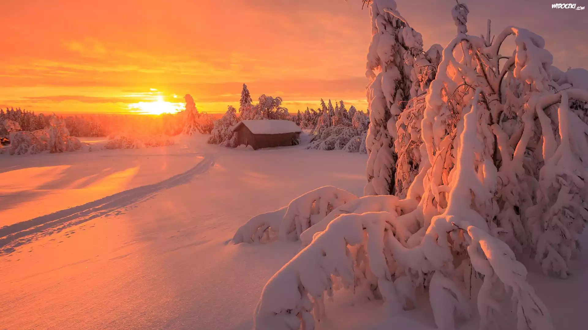 Zdjęcia, Zima, Promienie słońca, Dom, Drzewa, Ośnieżone, Gałęzie