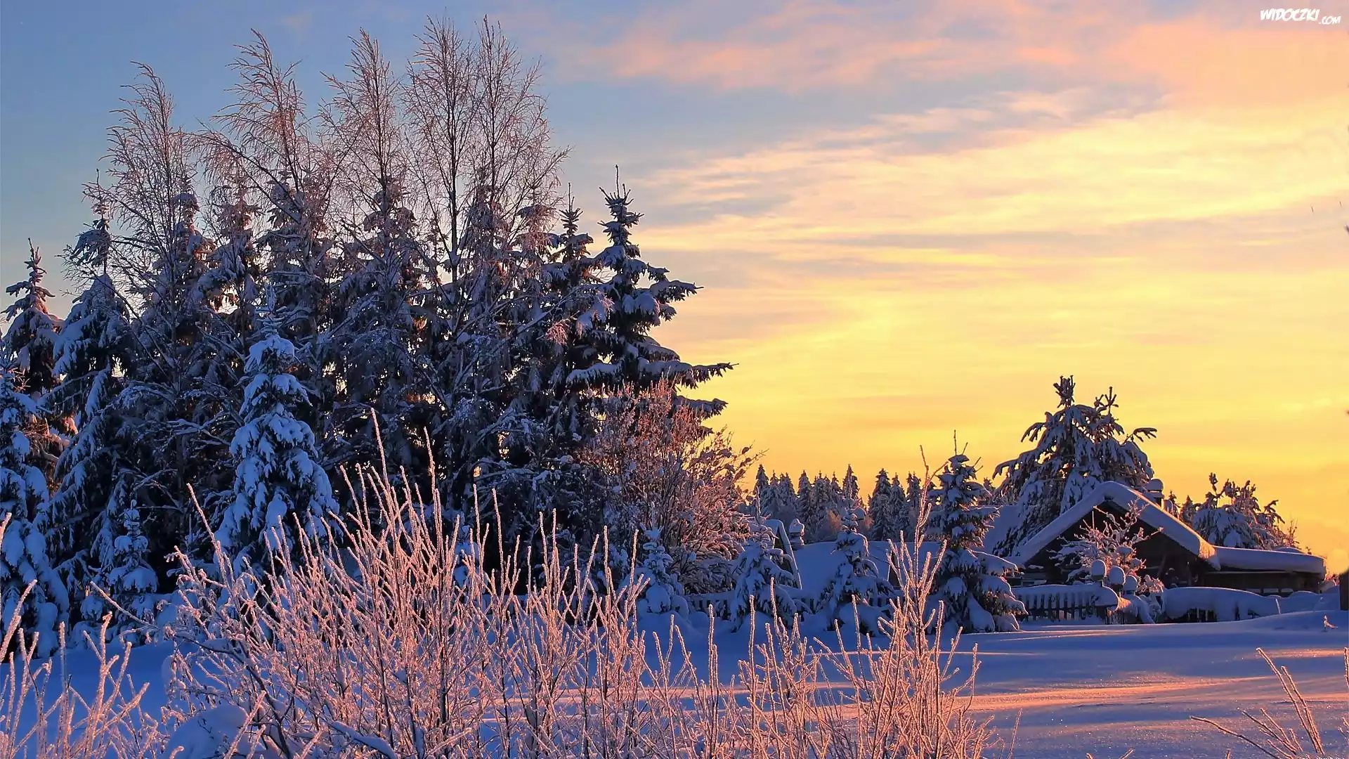 Dom, Drzewa, Wschód słońca, Zima