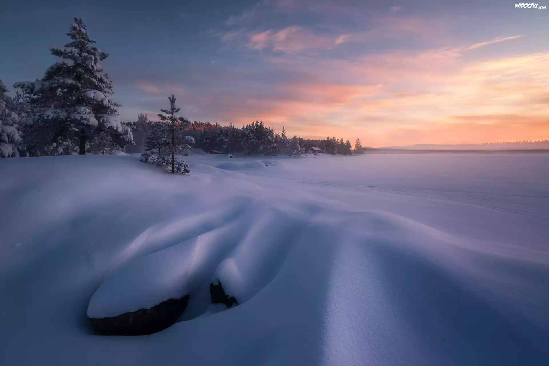 Zima, Las, Dom, Zachód słońca, Chmury, Zaśniezone, Jezioro, Drzewa, Ringerike, Norwegia
