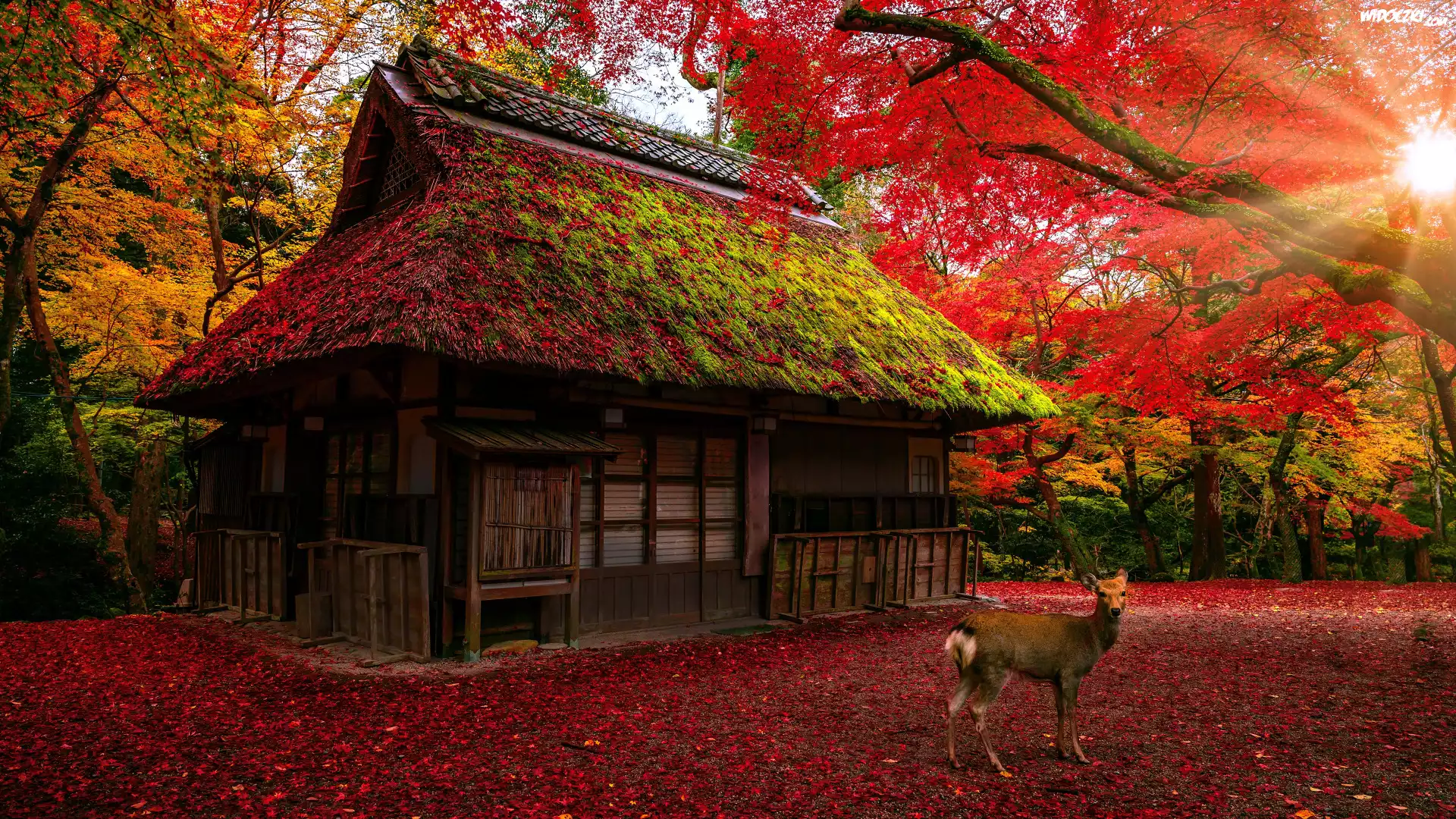 Dom, Jesień, Drzewa, Słońce, Sarna