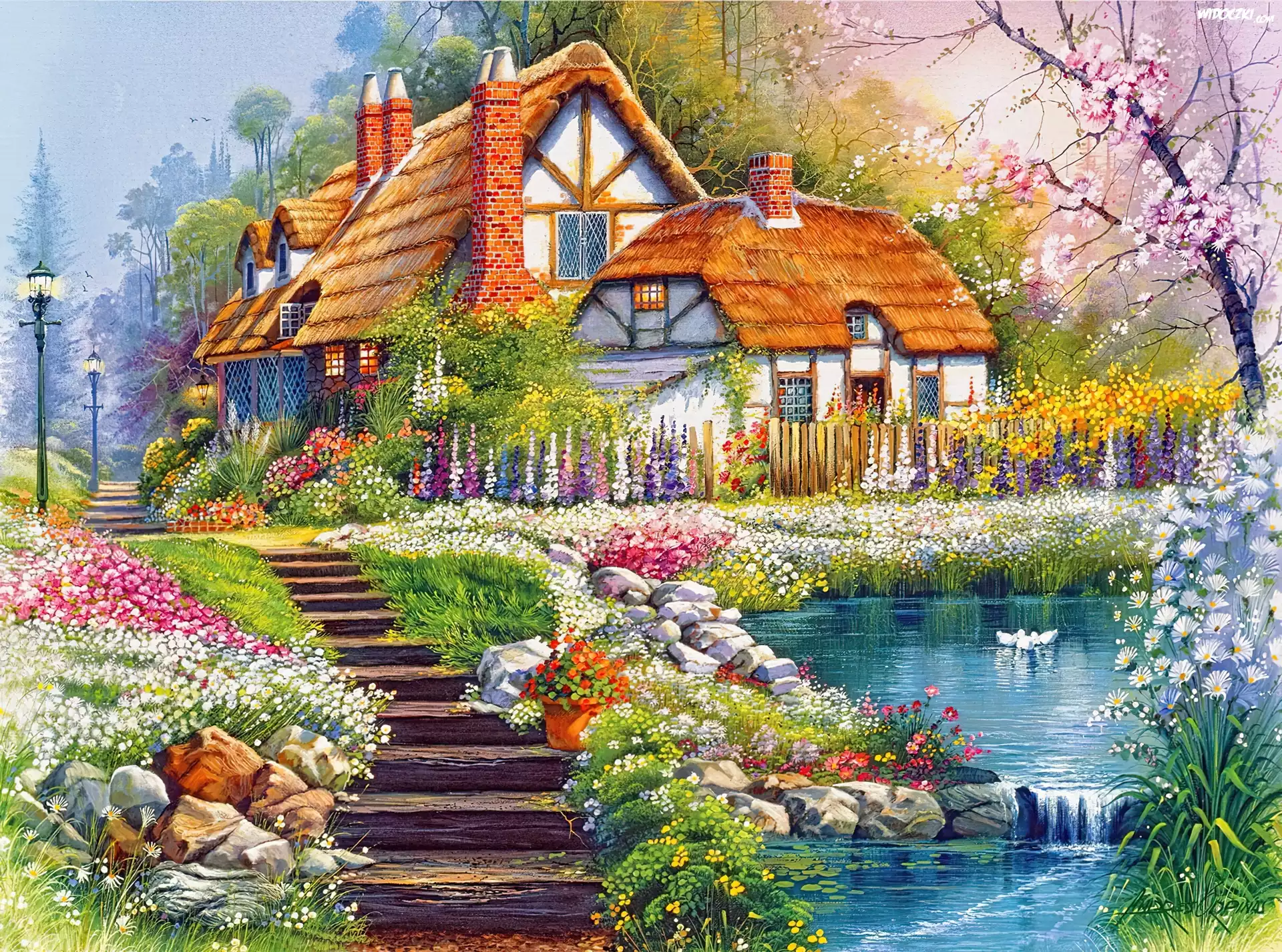 Zdjęcia, Dom, Ogród, Schody, Staw, Kwiaty