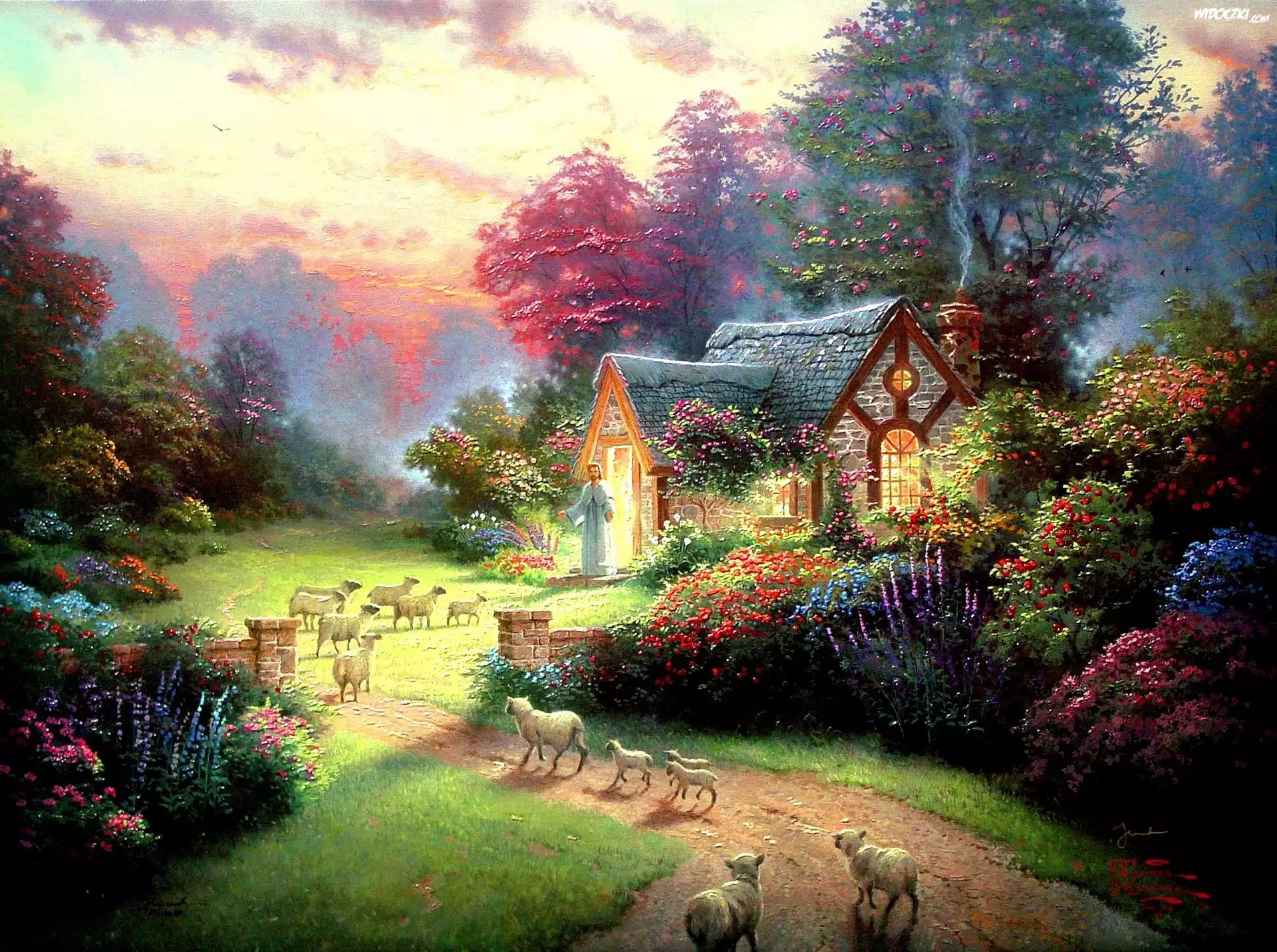 Zdjęcia, Dom, Droga, Owieczki, Thomas Kinkade