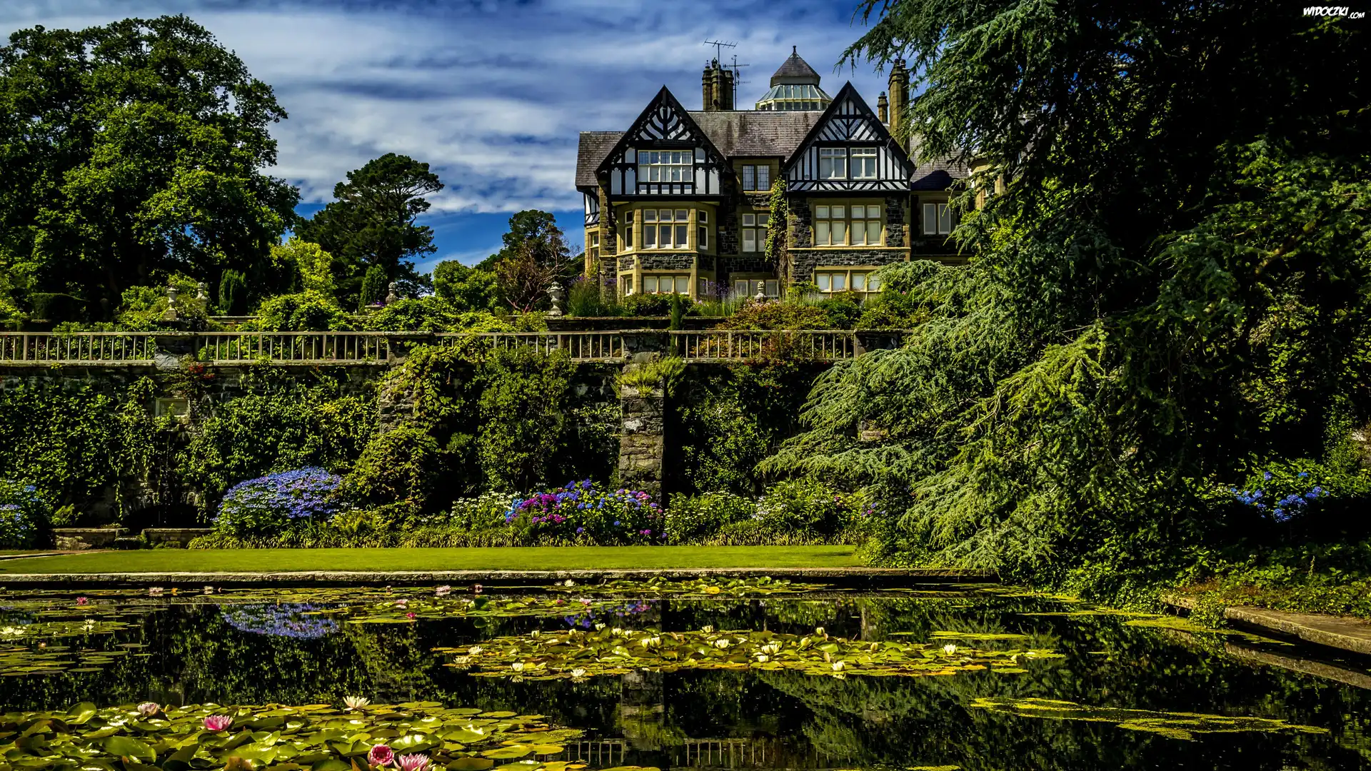 Walia, Ogród Botaniczny Bodnant Garden, Dom, Bodnant House, Staw, Roślinność, Lilie wodne