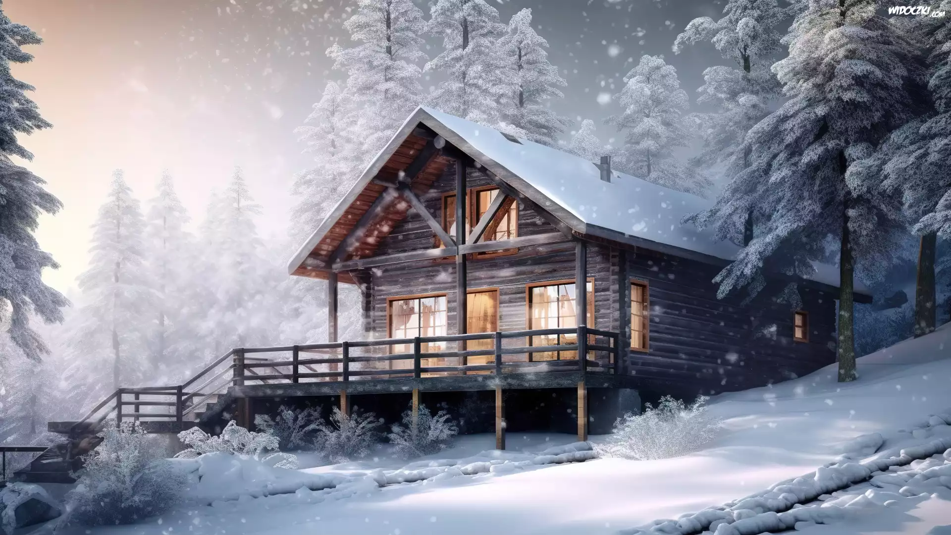 Zdjęcia, Zima, Śnieg, Wzgórze, Dom, Światła, Ośnieżone, Drzewa