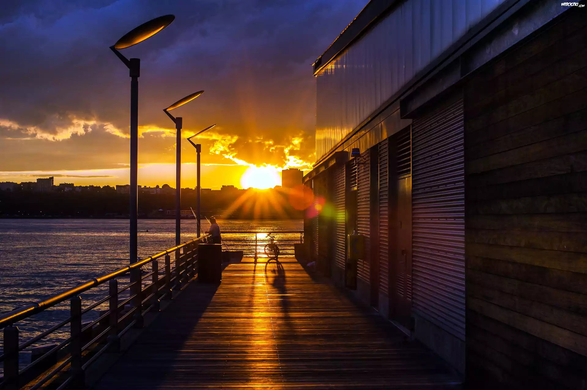 Zdjęcia, Dom, Pomost, Wędkarze, Rzeka, Zachód, Słońca
