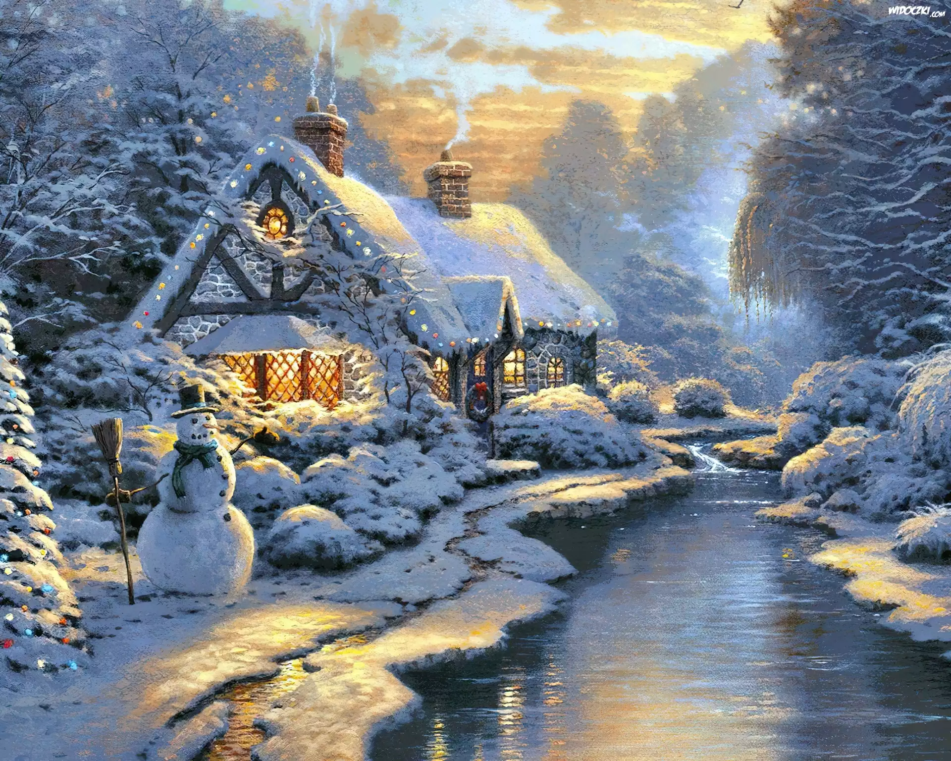 Zdjęcia, Dom, Bałwan, Zima, Rzeczka