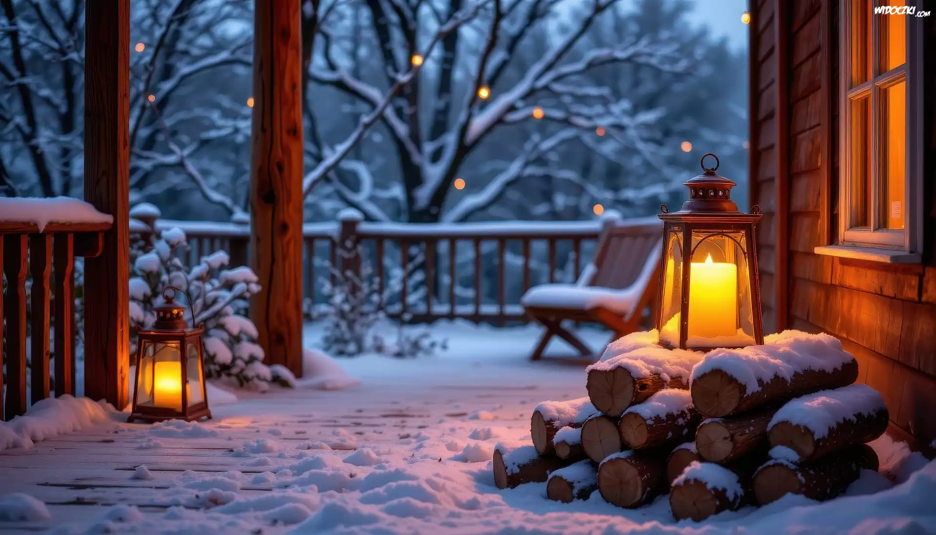 Lampiony, Szczapy, Drewna, Dom, Taras, Zima