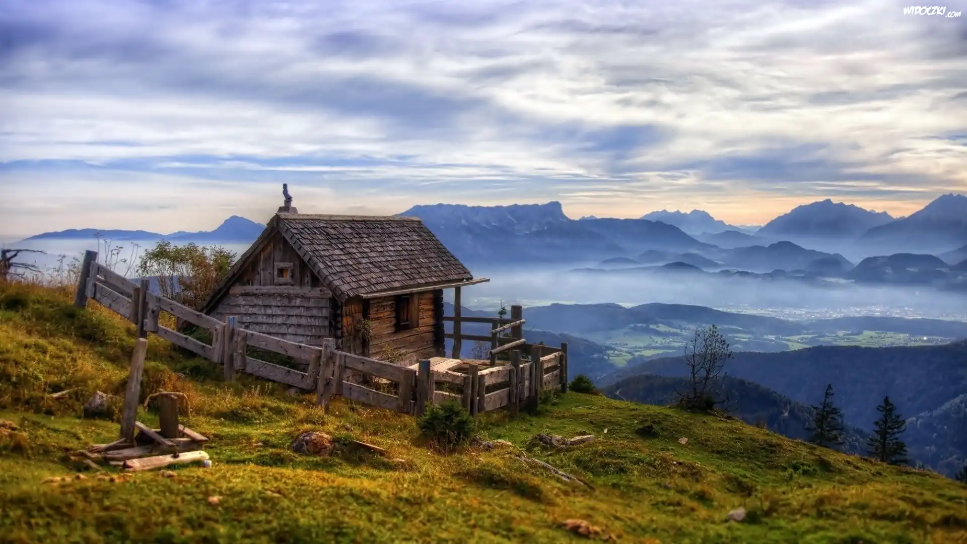 Zdjęcia, Mały, Domek, Góry, Lasy, Mgła, Dolina, Świt, Austria