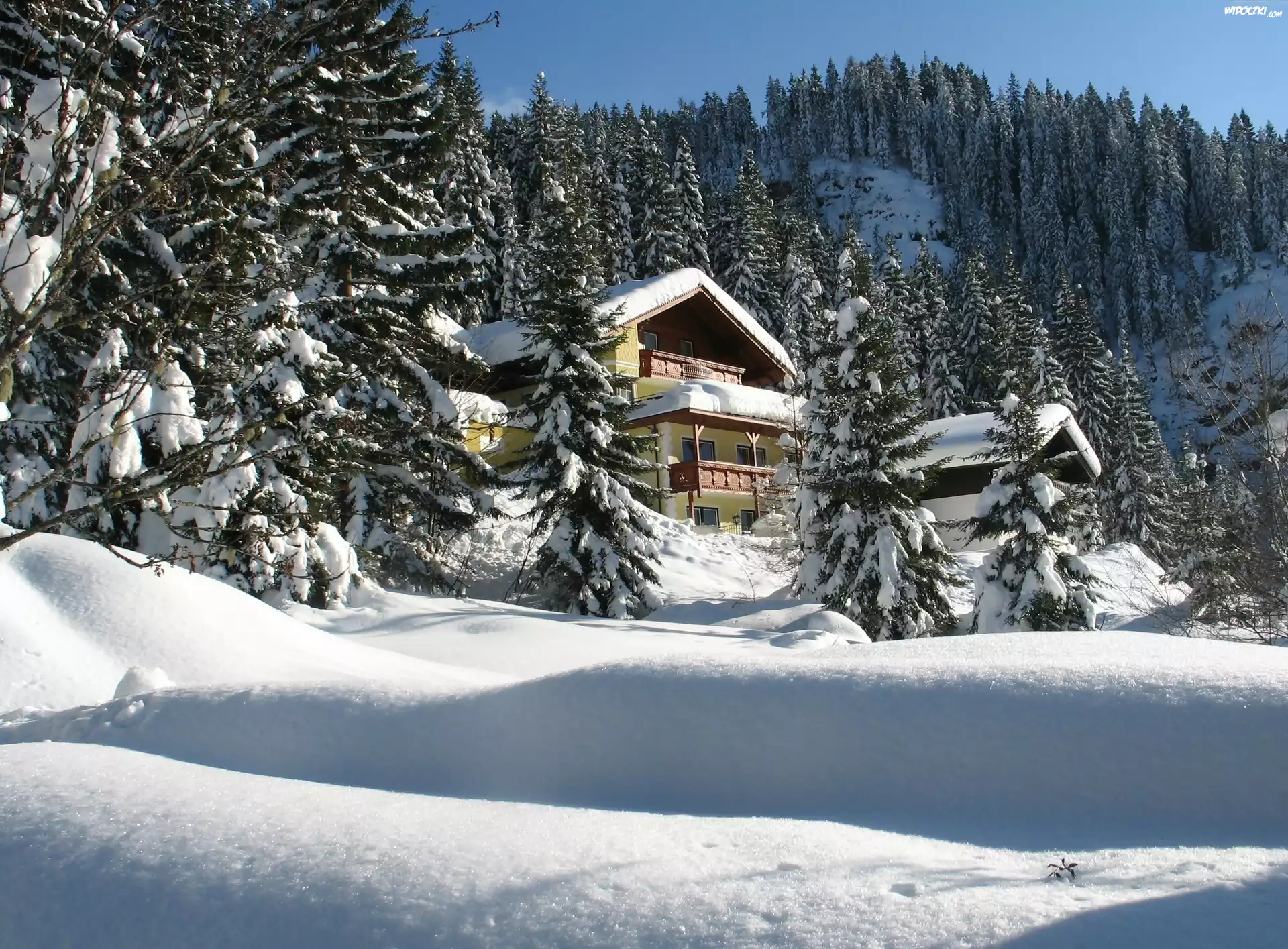 Zdjęcia, Domek, Ośnieżone, Choinki, Zaspy