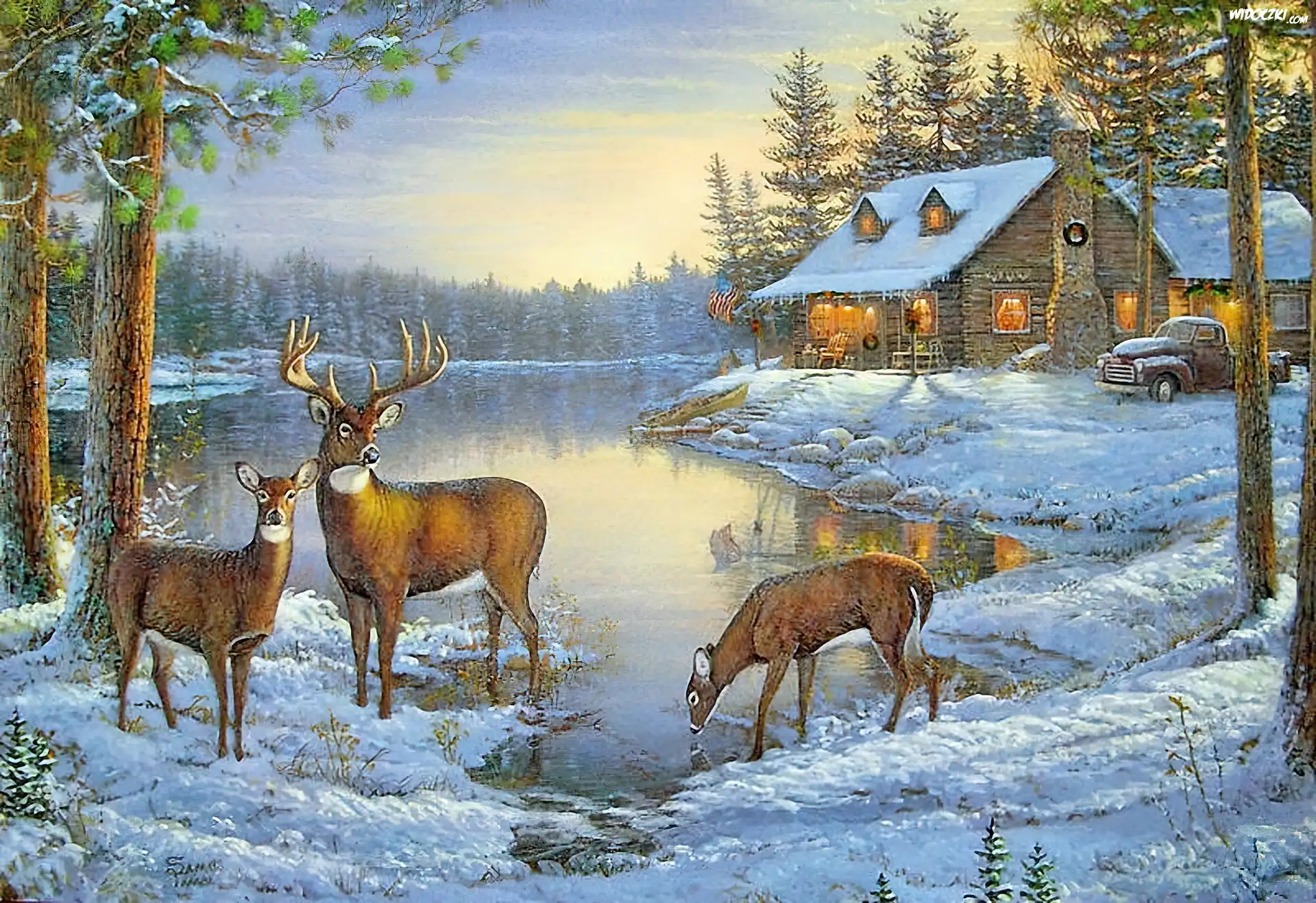 Domek, Jezioro, Zima, Jeleń, Sarny
