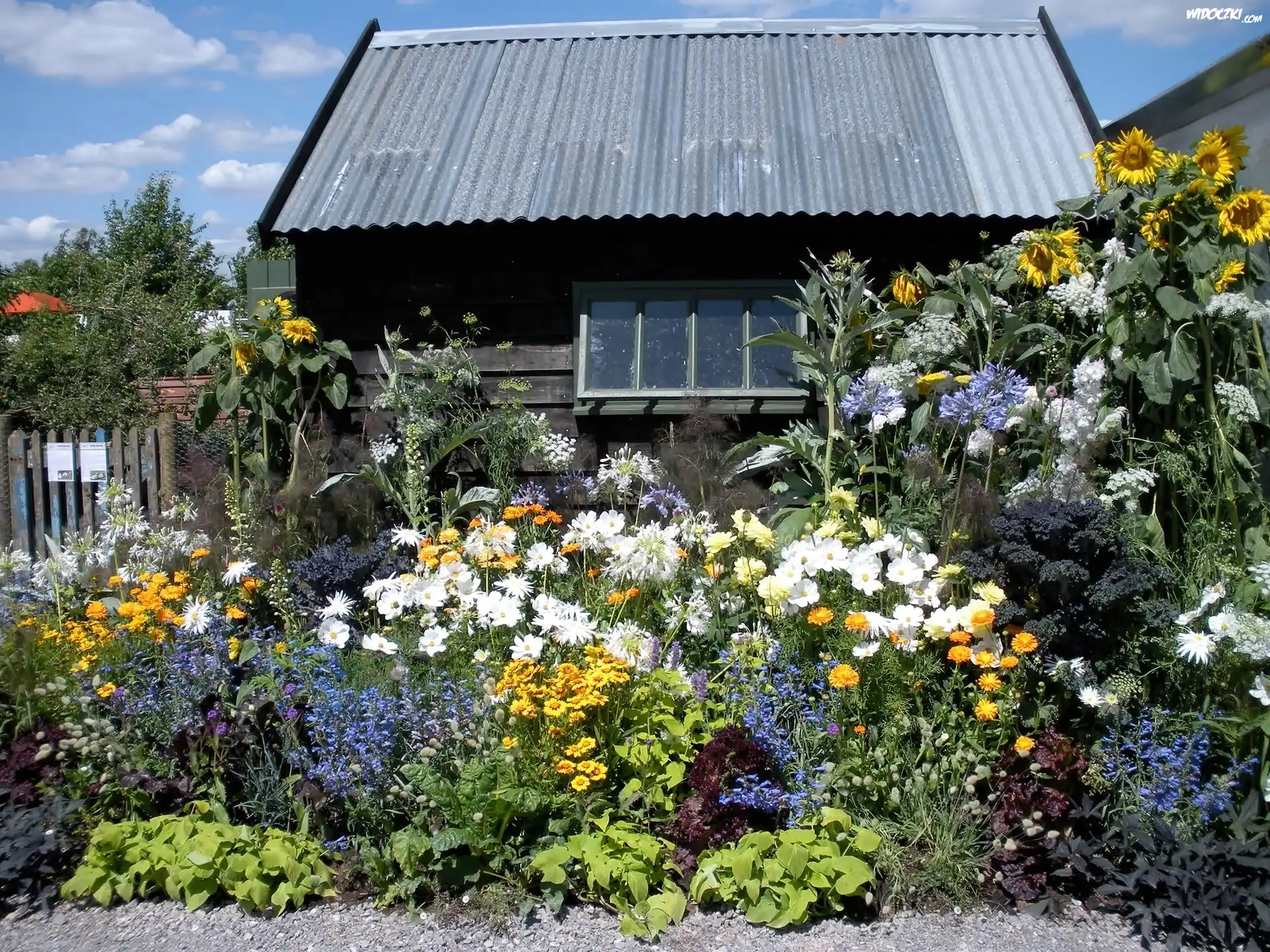 Domek, Ogródek, Kwiatowy, Słoneczniki