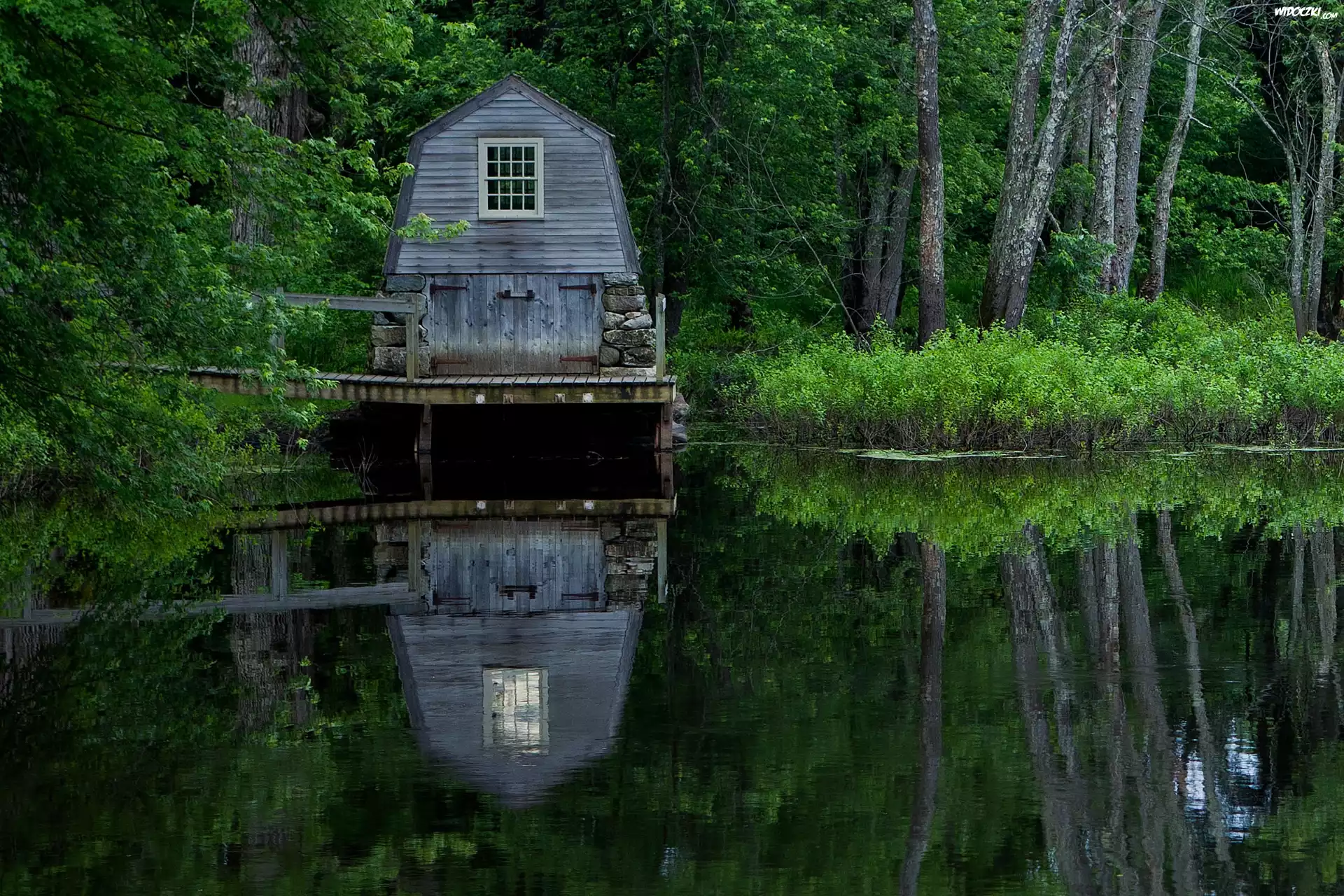 Zdjęcia, Domek, Jezioro, Las, Odbicie