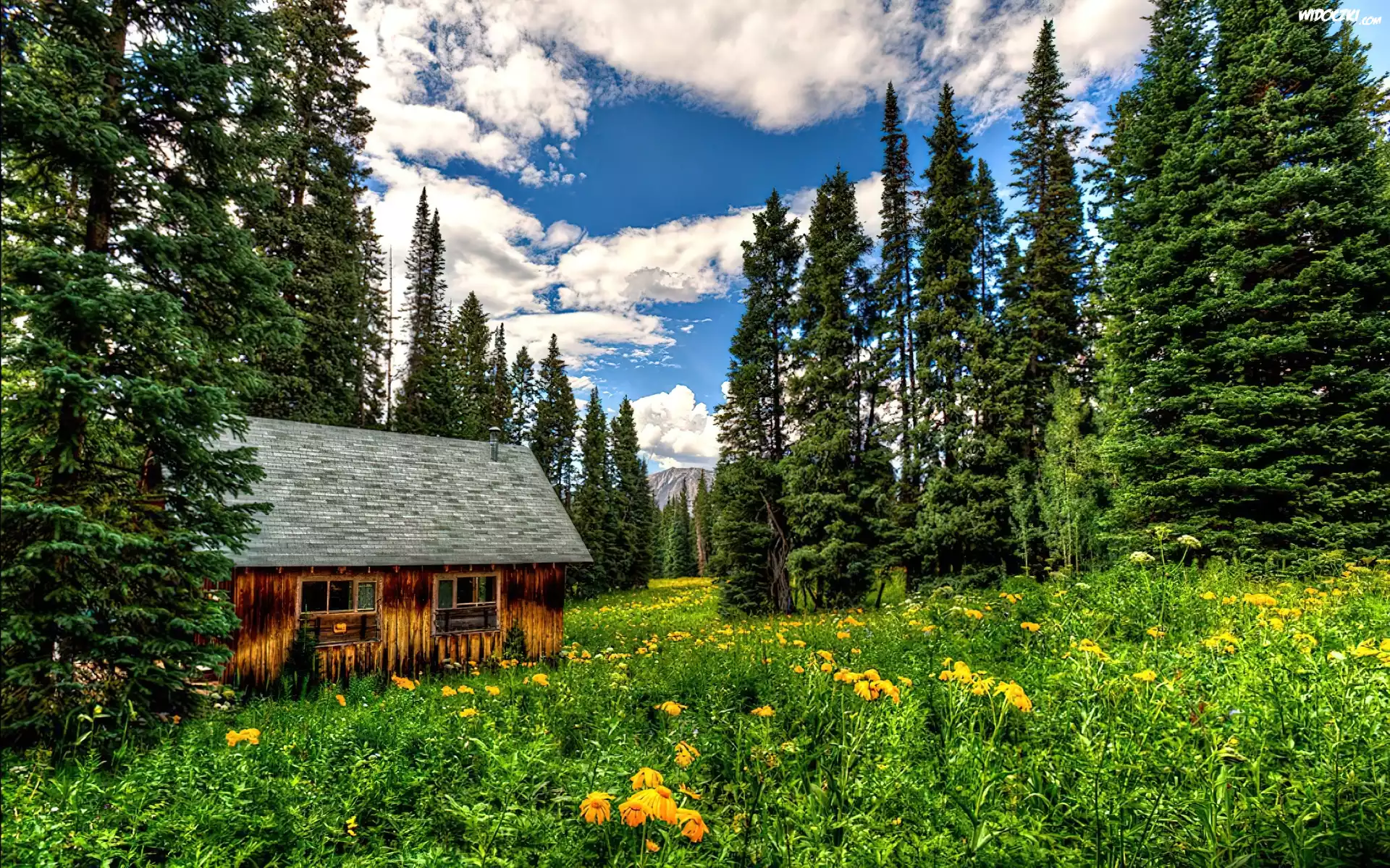 Zdjęcia, Domek, Łąka, Kwiaty, Góry, Lasy, Wiosna