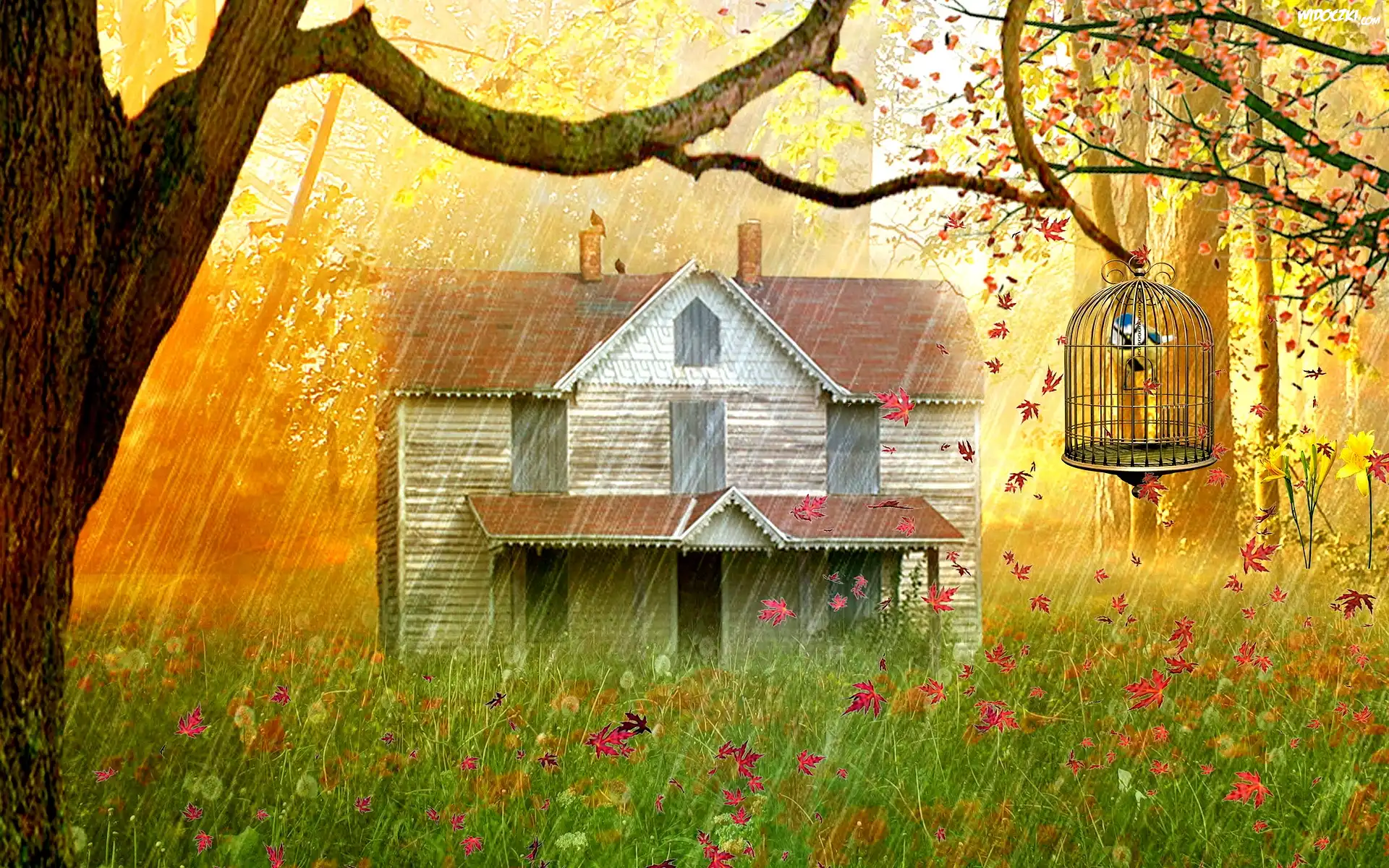 Domek, Drzewa, Trawa, Liście, Deszcz