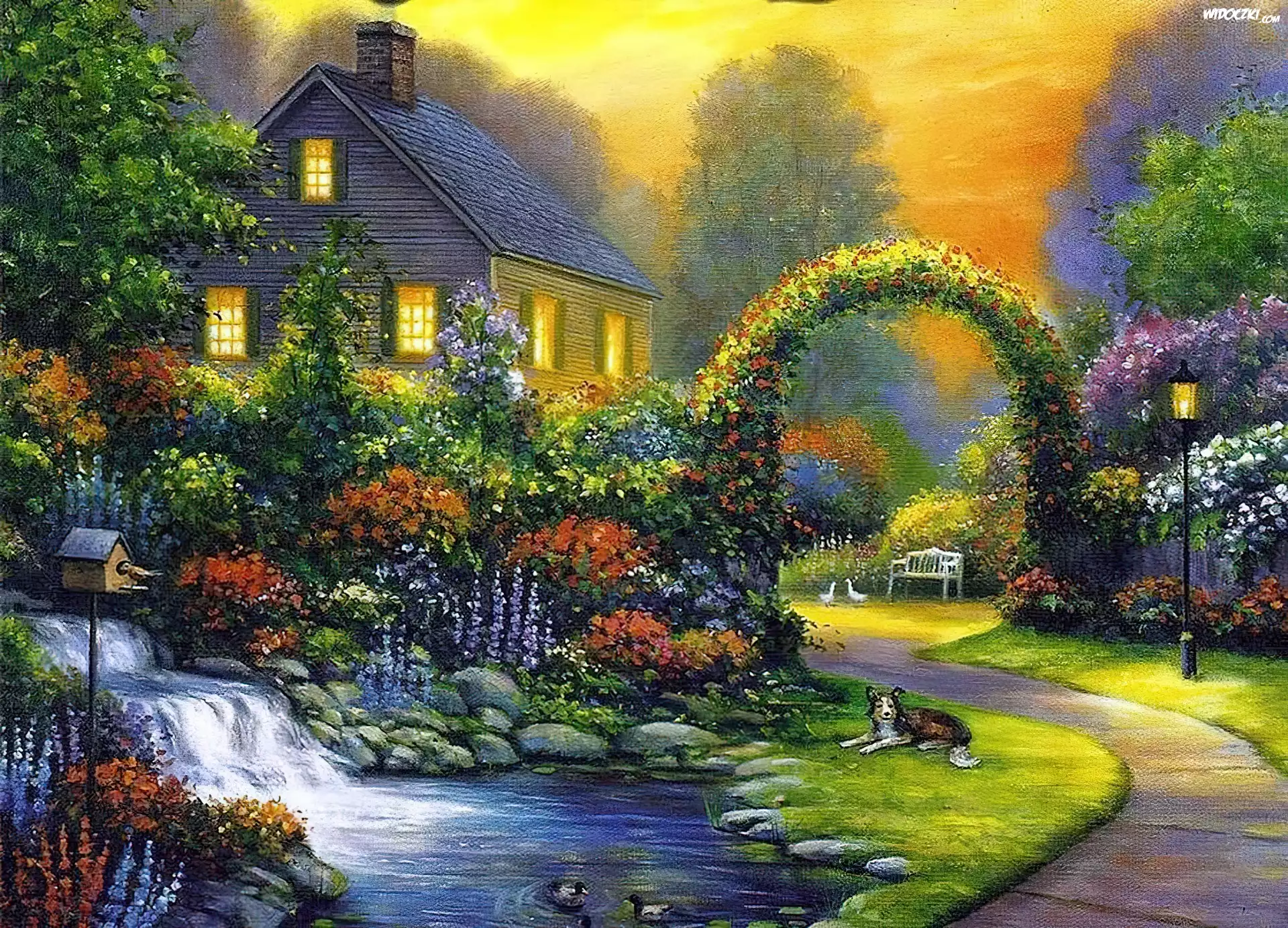 Domek, Ogród, Rzeczka, Pies
