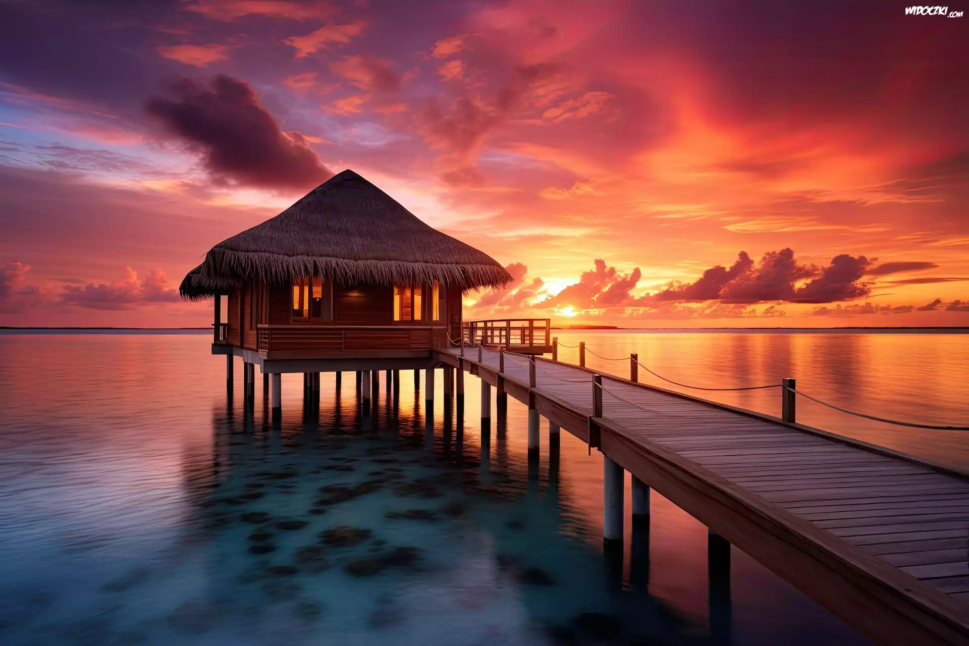 Zdjęcia, Morze, Zachód słońca, Domek, Bungalow, Pomost, Grafika