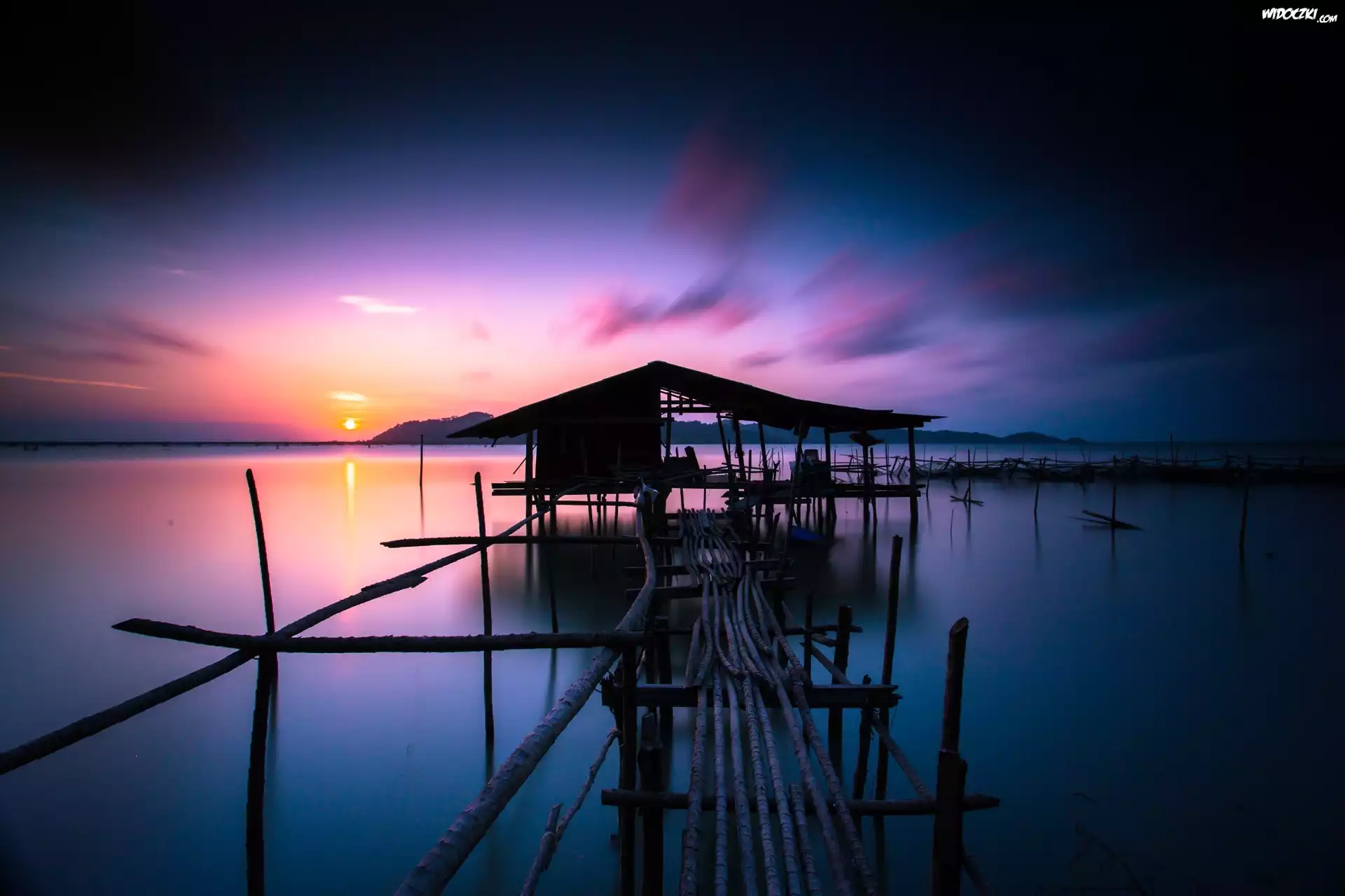 Zdjęcia, Domek, Morze, Zachód Słońca, Lato