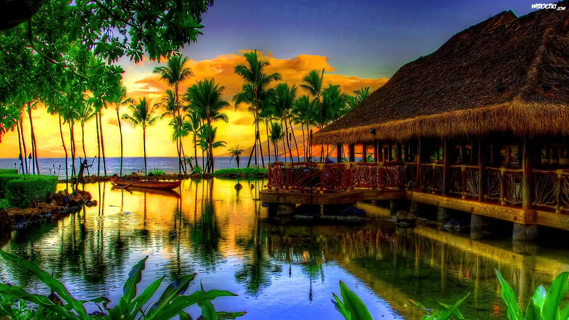 Zdjęcia, Domek, Palmy, Zachód, Słońca