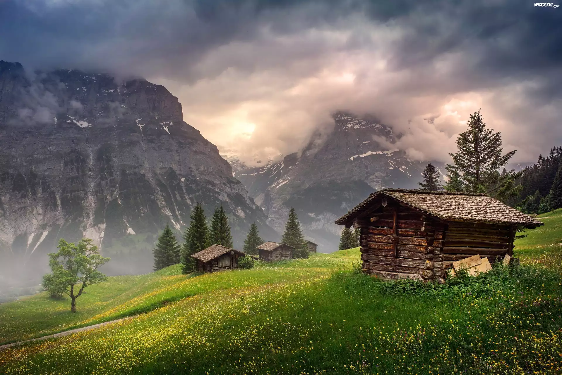Domki, Góry, Łąka, Chmury, Szwajcaria