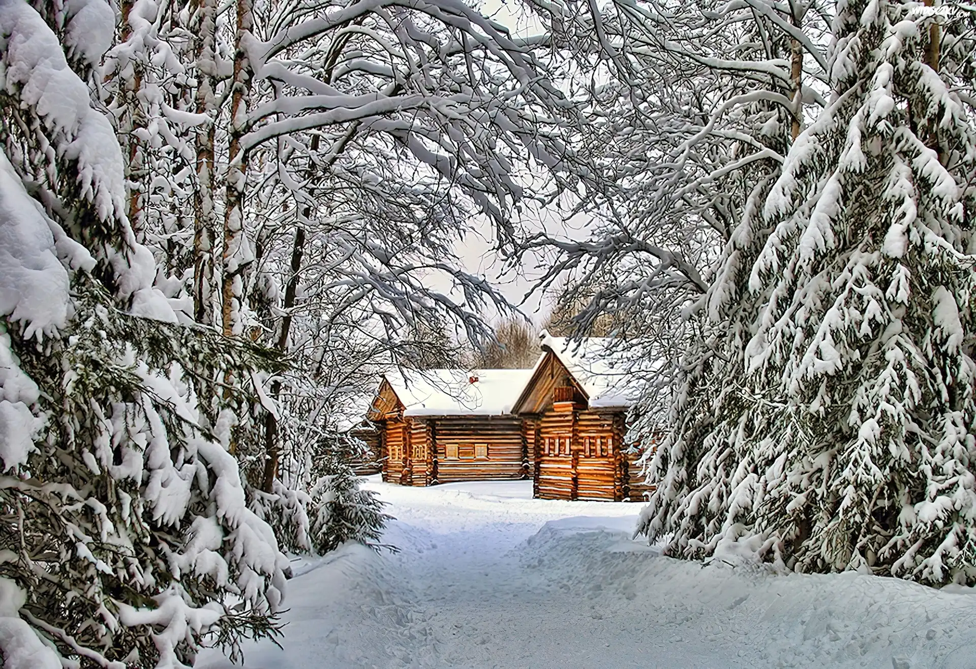 Zdjęcia, Domki, Ośnieżone, Choinki, Zima