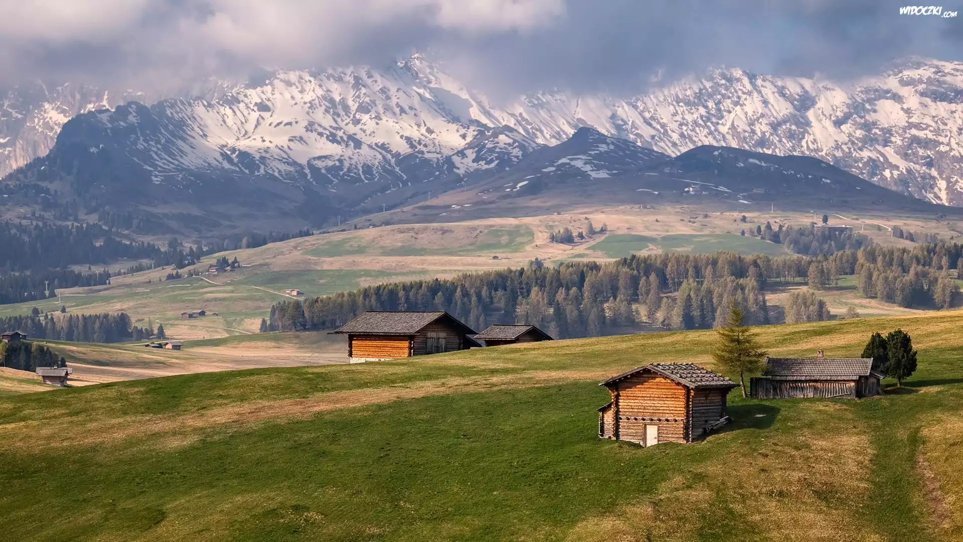 Dolomity, Góry Sassolungo, Drewniane, Domki, Płaskowyż Seiser Alm, Dolina Val Gardena, Drzewa, Chmury, Włochy |