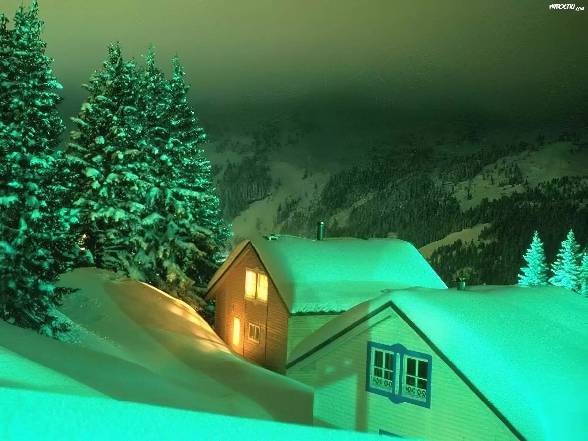 Domki, Ośnieżone, Drzewa, Noc