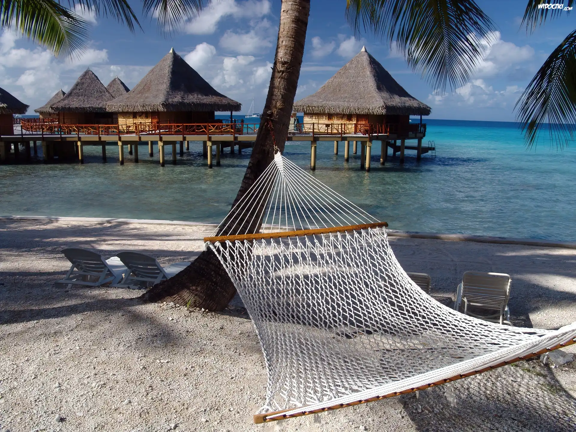 Zdjęcia, Domki, Woda, Piasek, Hamak, Drzewo