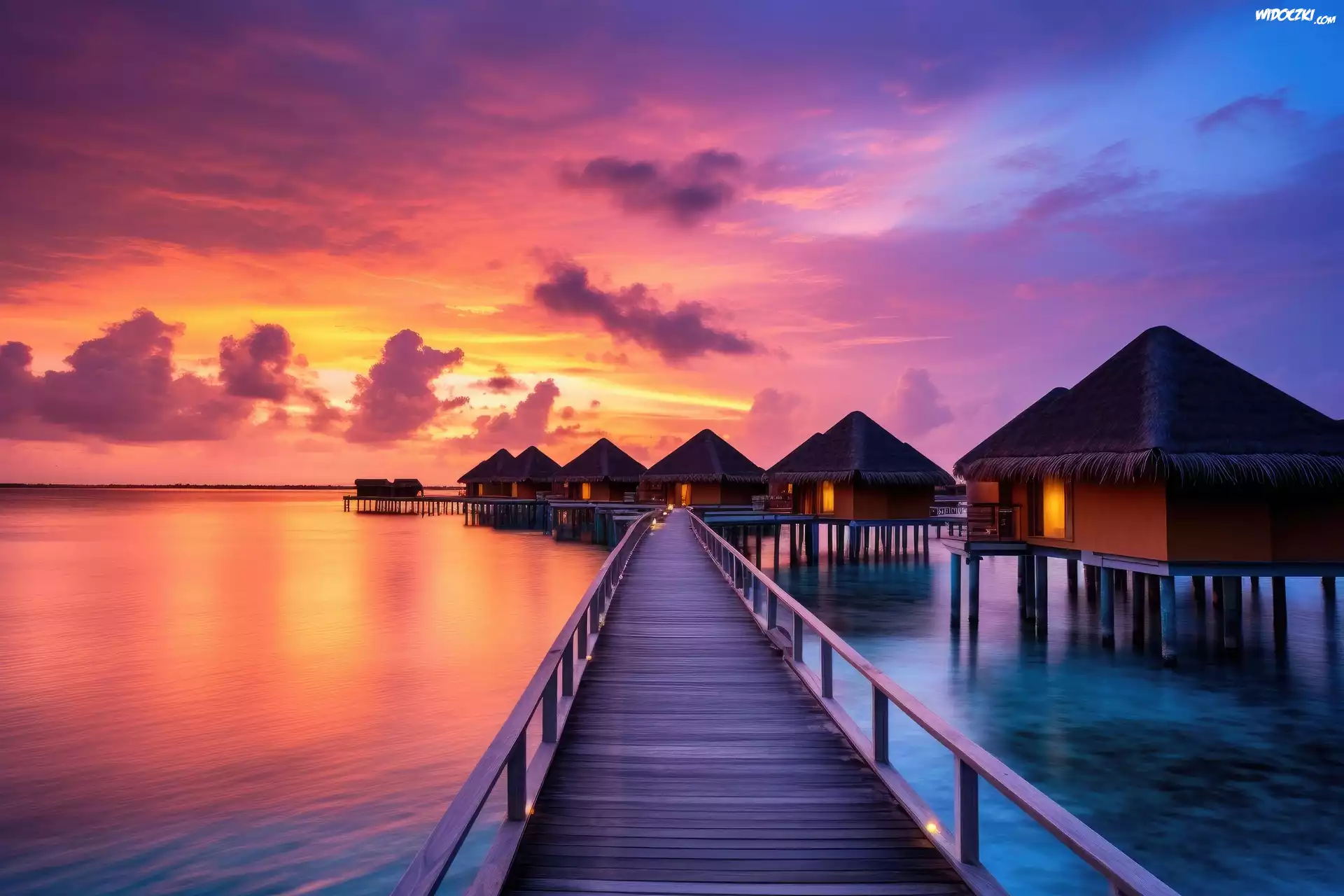 Zdjęcia, Pomost, Domki, Morze, Zachód słońca