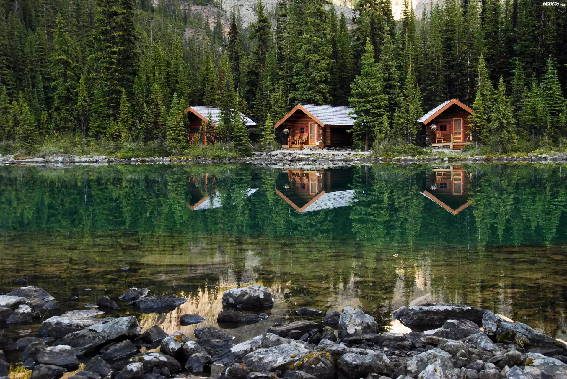 Zdjęcia, Kanada, Park Narodowy Yoho, Jezioro OHara, Kamienie, Las, Domki