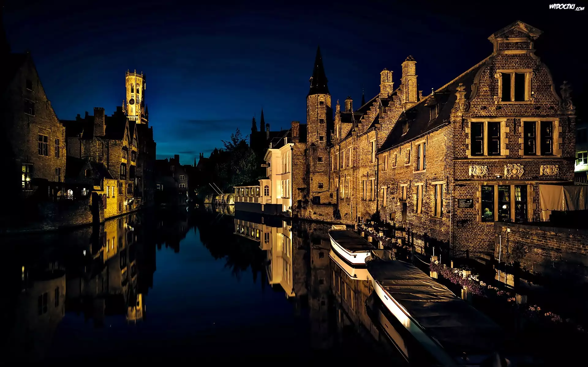 Zdjęcia, Domy, Kanał, Brugia, Noc