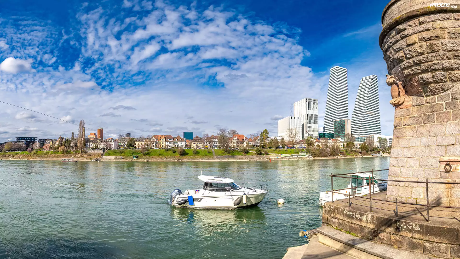 Zdjęcia, Szwajcaria, Bazylea, Budynki, Domy, Rzeka Ren, Motorówki