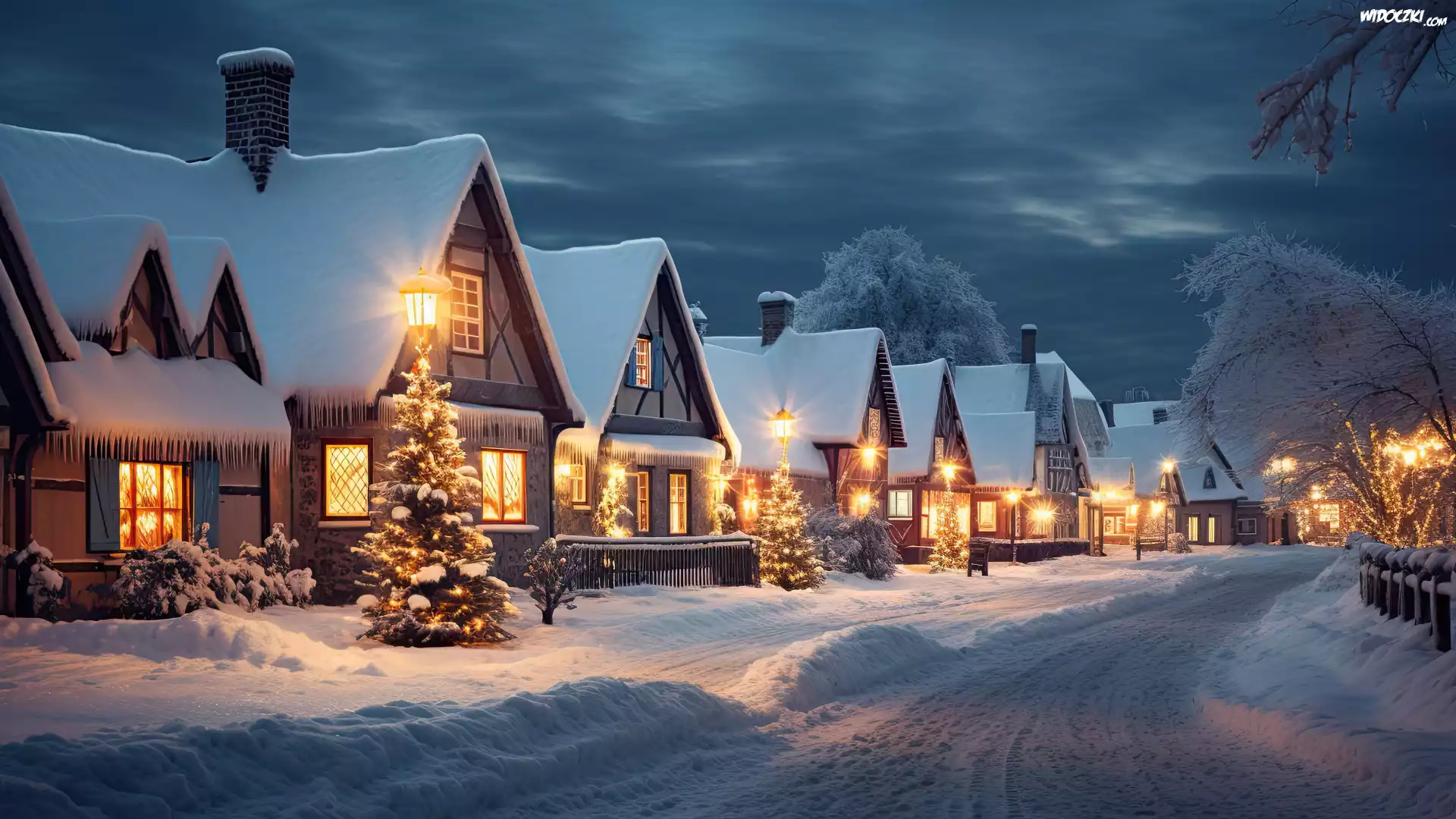 Zdjęcia, Zima, Ośnieżone, Choinki, Domy, Oświetlone, Grafika, Droga